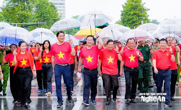 Lãnh đạo tỉnh Nghệ An mặc áo đỏ sao vàng, hát Quốc ca, đi bộ “Cùng Việt Nam tiến bước”