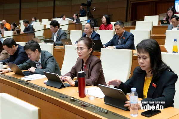 Các đại biểu Quốc hội đoàn Nghệ An tại phiên làm việc ngày 28/11 ở Hội trường Diên Hồng, Nhà Quốc hội. Ảnh: Cao Hoàng