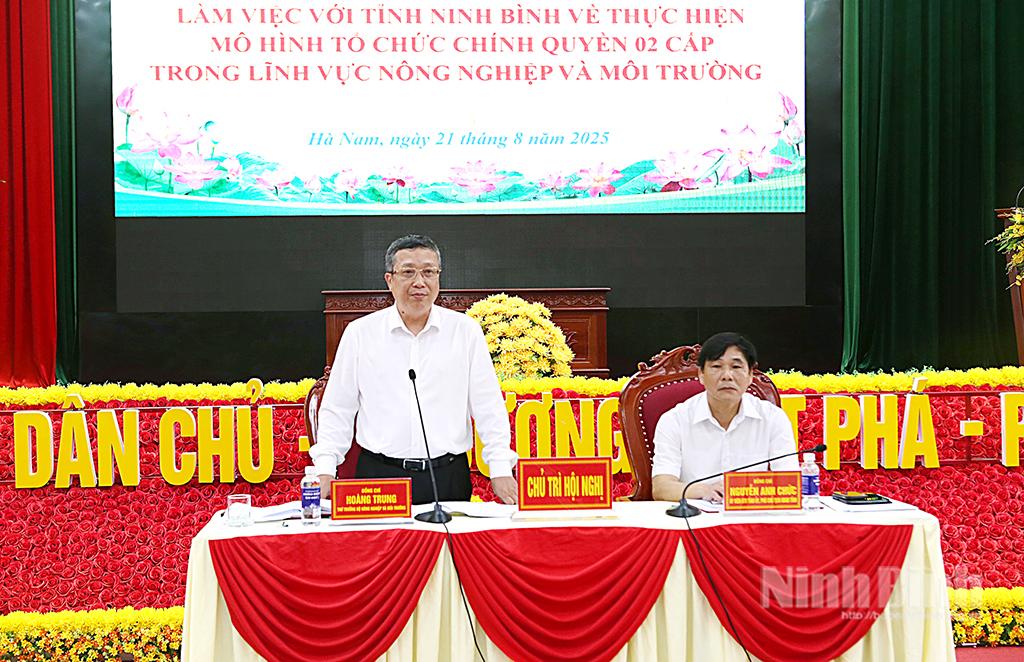 Ngày 21/8, tại phường Hà Nam, Đoàn công tác của Bộ Nông nghiệp và Môi trường (NN&MT) đã có buổi làm việc với UBND tỉnh Ninh Bình để tháo gỡ khó khăn, vướng mắc trong giai đoạn đầu vận hành mô hình tổ chức chính quyền địa phương hai cấp.