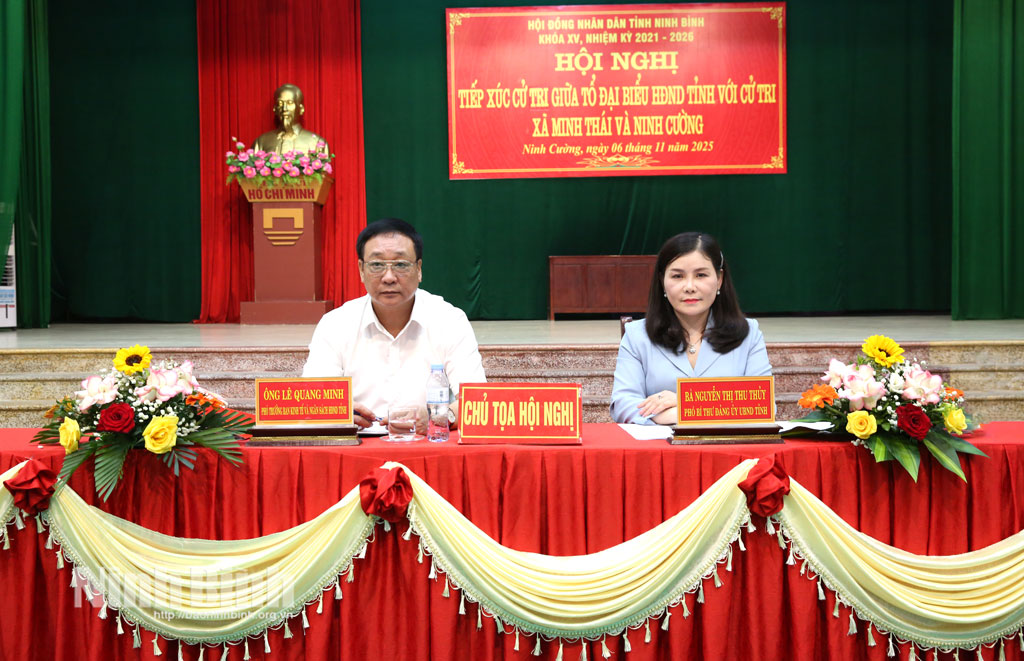 *Tổ đại biểu HĐND tỉnh đã tiếp xúc cử tri các xã Minh Thái và Ninh Cường. Dự hội nghị có các đồng chí: Nguyễn Thị Thu Thủy, Tỉnh ủy viên, Phó Bí thư Đảng ủy UBND tỉnh Ninh Bình; Lê Quang Minh, Trưởng Ban Kinh tế - Ngân sách HĐND tỉnh. Cùng dự có đại diện các sở, ngành của tỉnh và lãnh đạo địa phương.