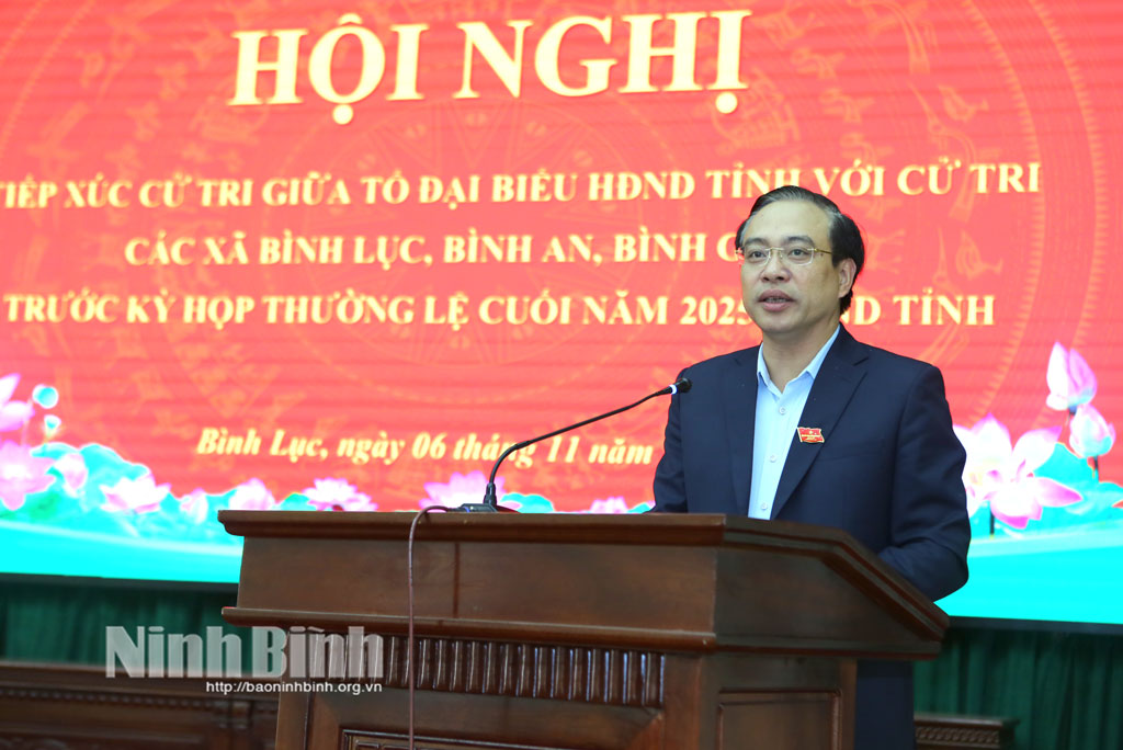 Tại hội nghị, cử tri các địa phương đã nêu ý kiến, kiến nghị: Đề nghị HĐND tỉnh, UBND tỉnh quan tâm tiếp tục có cơ chế hỗ trợ nông dân mua máy nông nghiệp (như máy làm đất cỡ lớn, máy bay phun thuốc trừ sâu, máy cấy); Tiếp tục có chính sách hỗ trợ cho các địa phương kiên cố hoá kênh mương để phục vụ tốt hơn cho sản xuất và hạn chế thiệt hại do thiên tai gây ra; Xem xét, làm bổ sung rãnh thoát nước bên đường 37B đoạn từ dốc Mỹ xuống ngã tư, đảm bảo tiêu thoát nước, vệ sinh môi trường và an toàn giao thông khi mưa lớn; Sửa chữa, thay thế cột, đèn tín hiệu, đèn chiếu sáng tại ngã tư đường ĐT499 giao với đường ĐX01 (giáp trục sở UBND xã Bình Lục) bị gãy, đổ nghiêng và hư hỏng; điều chỉnh hệ thống đèn báo tại nút giao giữa QL37B và ĐT499 hiện tín hiệu bị lỗi nhịp, không đồng bộ giữa đi thẳng và rẽ trái, gây bất tiện và mất an toàn cho người tham gia giao thông; Xem xét, khảo sát hiện trạng thực có kế hoạch đầu tư, sửa chữa khu nội tự đình Triều Hội nhằm bảo tồn di tích lịch sử Quốc gia này.…