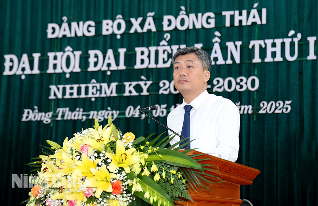 Phát biểu chỉ đạo tại Đại hội, đồng chí Chánh Văn phòng Tỉnh ủy Phạm Duy Hưng ghi nhận và đánh giá cao những nỗ lực, phấn đấu và kết quả đạt được của Đảng bộ, Chính quyền và Nhân dân xã Đồng Thái trong nhiệm kỳ qua. Đồng chí nhấn mạnh, thời gian tới, Đảng bộ xã tiếp tục xây dựng Đảng bộ thật sự trong sạch, vững mạnh, đổi mới phương thức lãnh đạo, siết chặt kỷ cương, phát huy vai trò nêu gương của cán bộ chủ chốt. Cụ thể hóa tiềm năng, lợi thế thành các giải pháp phát triển kinh tế - xã hội mang tính đột phá trong nhiệm kỳ tới để tránh bỏ lỡ cơ hội phát triển. Quan tâm, giữ gìn bảo tồn, phát triển các lĩnh vực văn hóa - xã hội, bảo vệ tốt cảnh quan, môi trường, chăm sóc sức khỏe nhân dân. Chủ động nắm tình hình, giải quyết tốt những phát sinh từ cơ sở, không để xuất hiện các điểm nóng, điểm phức tạp. Cần khẩn trương chỉ đạo cụ thể hóa Nghị quyết thành chương trình hành động, kế hoạch công tác; phân công rõ người, rõ việc, rõ tiến độ thực hiện; huy động và bố trí nguồn lực phù hợp để sớm đưa Nghị quyết vào cuộc sống, đạt kết quả cao nhất.
