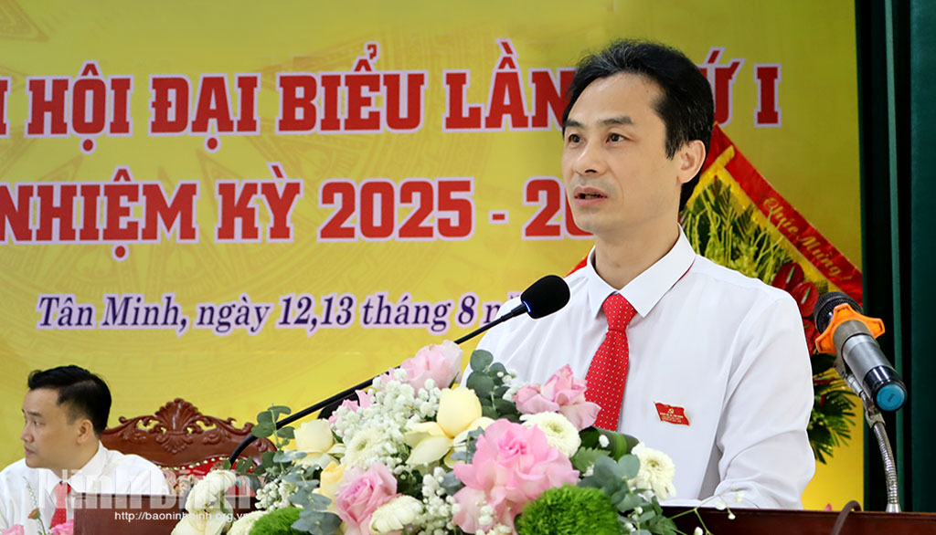 Phát biểu chỉ đạo Đại hội, đồng chí Nguyễn Toàn Thắng, Ủy viên Ban chấp hành Đảng bộ tỉnh, Phó Trưởng Ban Tuyên giáo và Dân vận Tỉnh ủy ghi nhận, biểu dương những kết quả Đảng bộ, chính quyền và nhân dân xã Tân Minh đã đạt được trong nhiệm kỳ qua. Đồng chí đề nghị Đảng bộ tiếp tục giữ vững, củng cố, vun đắp sự đoàn kết, thống nhất trong Đảng bộ và cả hệ thống chính trị. Chăm lo làm tốt công tác xây dựng Đảng và hệ thống chính trị; đặc biệt chú trọng xây dựng đội ngũ Ban chấp hành, cán bộ của xã có bản lĩnh chính trị, có phẩm chất đạo đức, năng lực, trình độ chuyên môn, có tư duy đổi mới, sáng tạo, năng động. Tập trung lãnh đạo phát triển kinh tế - xã hội. Quan tâm phát triển văn hóa, xã hội, chăm lo sự nghiệp giáo dục, y tế; xây dựng NTM…