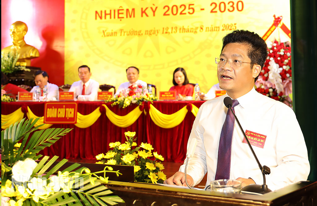 Phát biểu chỉ đạo tại Đại hội, đồng chí Phó Chủ tịch UBND tỉnh Trần Anh Dũng ghi nhận và biểu dương những kết quả, thành tích mà Đảng bộ, chính quyền và Nhân dân xã Xuân Trường đạt được trong nhiệm kỳ qua. Đồng chí đề nghị, nhiệm kỳ tới, Đảng bộ xã tiếp tục tăng cường công tác xây dựng Đảng, luôn xác định đây là nhiệm vụ then chốt, là điều kiện quyết định thành công của mọi nhiệm vụ chính trị. Chú trọng công tác quy hoạch, tập trung rà soát, quy hoạch, cơ cấu lại không gian lãnh thổ, xác định rõ tiềm năng, thế mạnh của địa phương và quan điểm, định hướng, mục tiêu phát triển đảm bảo phù hợp, phát huy tối đa những gì địa phương có. Ưu tiên nguồn lực cho xây dựng kết cấu hạ tầng; huy động và sử dụng hiệu quả các nguồn lực, nhất là nguồn lực trong Nhân dân, cộng đồng doanh nghiệp. Rà soát, hoàn thiện, nâng cao chất lượng các tiêu chí xã nông thôn mới nâng cao, nông thôn mới kiểu mẫu. Chú trọng phát triển toàn diện văn hoá - xã hội, đảm bảo an sinh xã hội. Tập trung hoàn thiện tổ chức bộ máy chính quyền địa phương 2 cấp; tiếp tục sắp xếp, kiện toàn, tinh gọn tổ chức và hoạt động các cơ quan, đơn vị của xã; xây dựng chính quyền trong sạch, vững mạnh, quản lý thông minh, nâng cao hiệu năng - hiệu lực - hiệu quả hoạt động. Sau Đại hội, đồng chí đề nghị Ban Chấp hành Đảng bộ xã Xuân Trường khẩn trương tổ chức quán triệt và cụ thể hoá Nghị quyết Đại hội, tập trung triển khai các chương trình, kế hoạch hành động để Nghị quyết sớm đi vào thực tiễn cuộc sống.