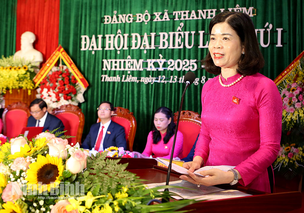 Phát biểu chỉ đạo tại Đại hội, đồng chí Phạm Thị Thu Hằng, Ủy viên Ban Thường vụ Tỉnh ủy, Tổng Biên tập Báo và phát thanh, truyền hình Ninh Bình ghi nhận và đánh giá cao những nỗ lực và kết quả đạt được của Đảng bộ, chính quyền và Nhân dân xã Thanh Liêm trong nhiệm kỳ qua; đồng thời, nhấn mạnh những nhiệm vụ trọng tâm địa phương cần thực hiện trong thời gian tới. Để đồng hành cùng với tỉnh trong thực hiện nhiệm vụ phát triển kinh tế - xã hội, đồng chí đề nghị Đảng bộ xã tiếp tục đổi mới mạnh mẽ phương thức lãnh đạo của Đảng, trọng tâm là nâng cao năng lực lãnh đạo, sức chiến đấu của các tổ chức Đảng; xây dựng Đảng và hệ thống chính trị trong sạch, vững mạnh. Đây là nhiệm vụ then chốt để đảm bảo sự lãnh đạo toàn diện của Đảng đối với mọi hoạt động của xã. Tập trung đẩy mạnh phát triển kinh tế - xã hội, phát huy nguồn lực tổng hợp của địa phương để đầu tư xây dựng kết cấu hạ tầng kỹ thuật đồng bộ. Đẩy mạnh chuyển dịch cơ cấu kinh tế, tăng tỷ trọng kinh tế công nghiệp, dịch vụ, làm cơ sở cho việc đẩy nhanh tốc độ đô thị hóa, từng bước hình thành hệ sinh thái công nghiệp - đô thị - dịch vụ, đặc biệt là làm tốt công tác GPMB phục vụ các dự án công nghiệp tại địa bàn. Đẩy mạnh chuyển đổi số toàn diện. Quan tâm làm tốt công tác an sinh xã hội, giảm nghèo bền vững. Tiếp tục xây dựng đội ngũ cán bộ, công chức đủ phẩm chất, năng lực và uy tín, ngang tầm nhiệm vụ trong giai đoạn mới, nâng cao hiệu quả hoạt động của bộ máy chính quyền địa phương hai cấp. Phát triển các lĩnh vực văn hóa, xã hội, bảo vệ tốt cảnh quan, môi trường, chăm sóc sức khỏe nhân dân.