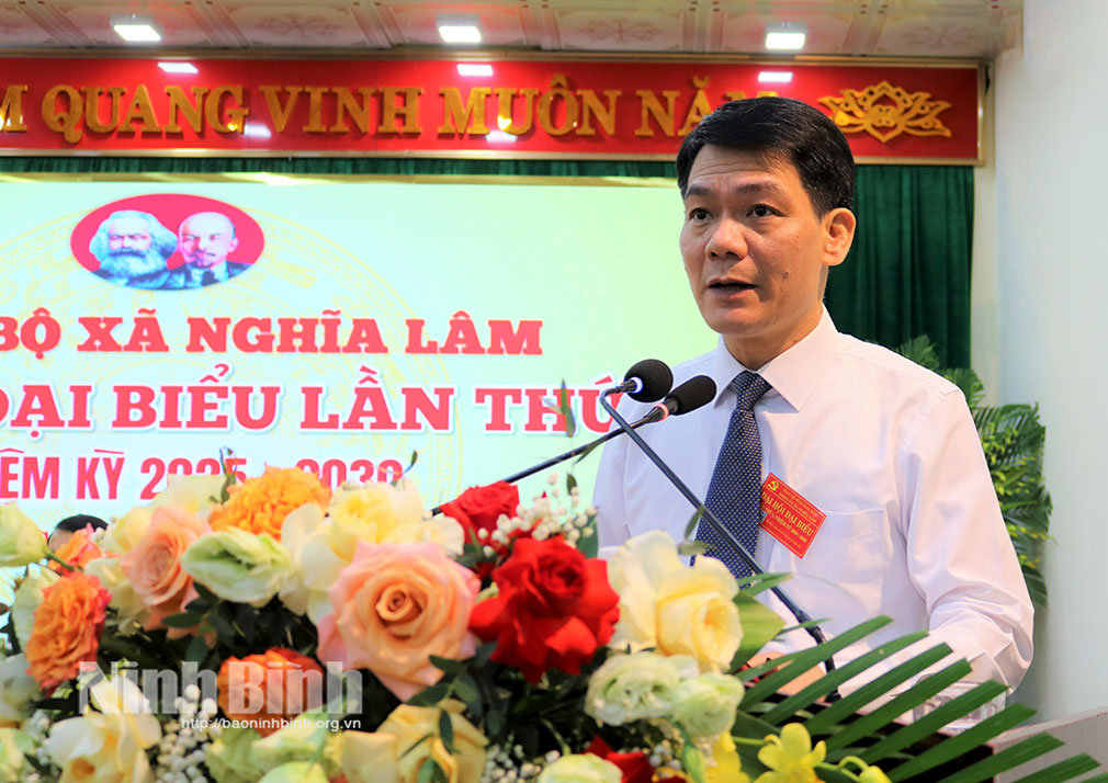 Phát biểu chỉ đạo tại Đại hội, đồng chí Nguyễn Đức Toàn, Ủy viên Ban Thường vụ Tỉnh ủy, Trưởng Ban Tuyên giáo và Dân vận Tỉnh ủy ghi nhận, đánh giá cao kết quả đạt được của Đảng bộ xã Nghĩa Lâm trong nhiệm kỳ qua. Đồng thời đề nghị: Đảng bộ, chính quyền và nhân dân xã Nghĩa Lâm cần xác định nhiệm kỳ 2025-2030 là giai đoạn đặc biệt quan trọng, đặt nền móng cho quá trình xây dựng và phát triển, đưa địa phương vững bước tiến vào kỷ nguyên mới - kỷ nguyên phát triển giàu mạnh, thịnh vượng của dân tộc. Vì vậy, cần tăng cường xây dựng Đảng và hệ thống chính trị trong sạch, vững mạnh; nâng cao năng lực quản lý, điều hành của chính quyền xã và thực hiện công khai, minh bạch hoạt động của cơ quan hành chính; tạo ra các dịch vụ công tiện ích cho các tổ chức, doanh nghiệp và người dân.