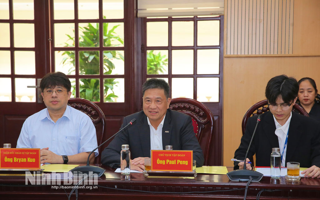 Tại buổi tiếp, ông Paul Peng bày tỏ niềm vinh dự khi lần đầu tiên đến Việt Nam và nhận được sự đón tiếp trọng thị từ lãnh đạo tỉnh Ninh Bình. Ông khẳng định, Việt Nam nói chung và tỉnh Ninh Bình nói riêng đang là điểm đến quan trọng trong chiến lược mở rộng toàn cầu của Tập đoàn AUO - một trong những doanh nghiệp hàng đầu thế giới về sản xuất màn hình hiển thị, đồng thời mở rộng sang lĩnh vực thương mại và bán lẻ. Đại diện Tập đoàn cũng nhấn mạnh mong muốn tìm hiểu sâu hơn về tiềm năng, lợi thế của tỉnh để giới thiệu tới cộng đồng doanh nghiệp Đài Loan, từ đó mở ra cơ hội hợp tác đầu tư lâu dài. Cũng nhân dịp này, ông Paul Peng trân trọng mời lãnh đạo tỉnh thăm và làm việc tại Đài Loan nhằm thúc đẩy sự hiểu biết và gắn kết hợp tác giữa hai bên.