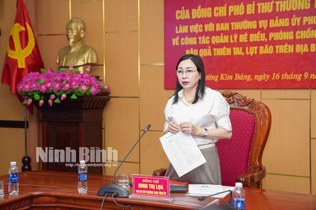Chiều 16/9, đồng chí Đinh Thị Lụa, Phó Bí thư Thường trực Tỉnh ủy đã có buổi làm việc với Ban Thường vụ Đảng ủy phường Kim Bảng về công tác quản lý đê điều, phòng, chống và khắc phục hậu quả thiên tai, lụt bão trên địa bàn phường.