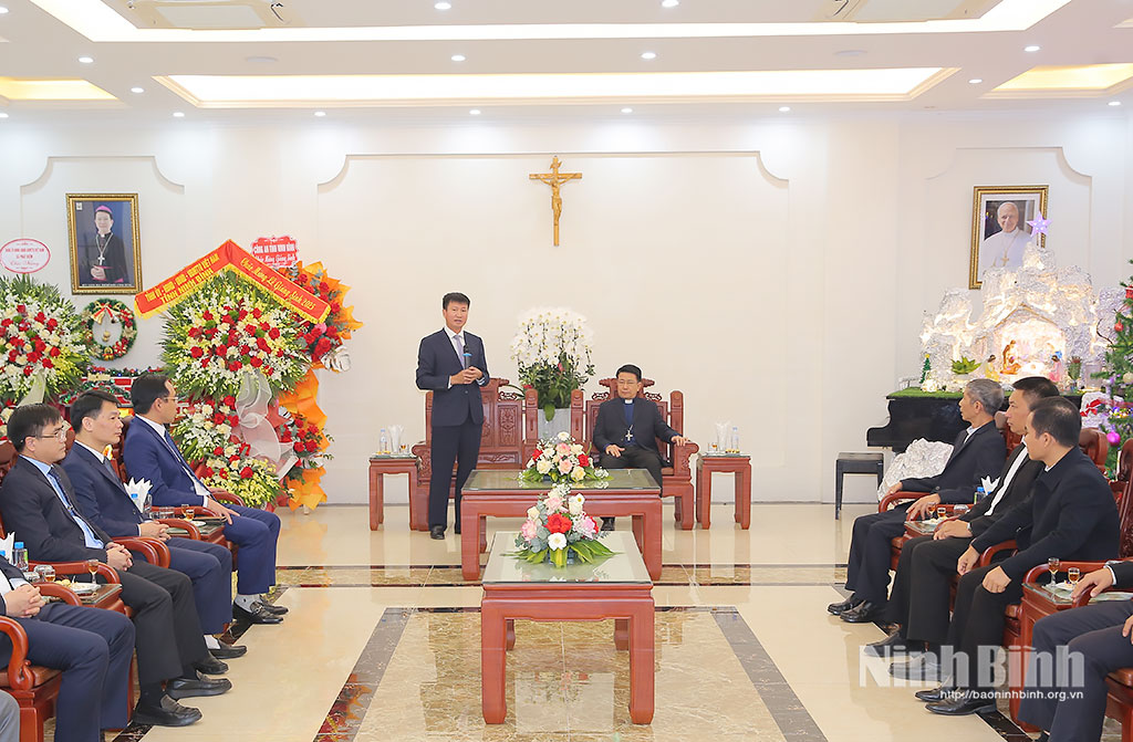 Thay mặt Tỉnh ủy, HĐND, UBND, Ủy ban MTTQ Việt Nam tỉnh, đồng chí Chủ tịch UBND tỉnh Trần Huy Tuấn đã tặng lẵng hoa tươi thắm, gửi lời chúc mừng tốt đẹp nhất đến Giám mục Giáo phận Phát Diệm Kiều Công Tùng, các linh mục, chức sắc, tu sĩ và toàn thể đồng bào Công giáo Giáo phận Phát Diệm, chúc một mùa Giáng sinh an lành, hạnh phúc, tràn đầy hồng ân Thiên Chúa.