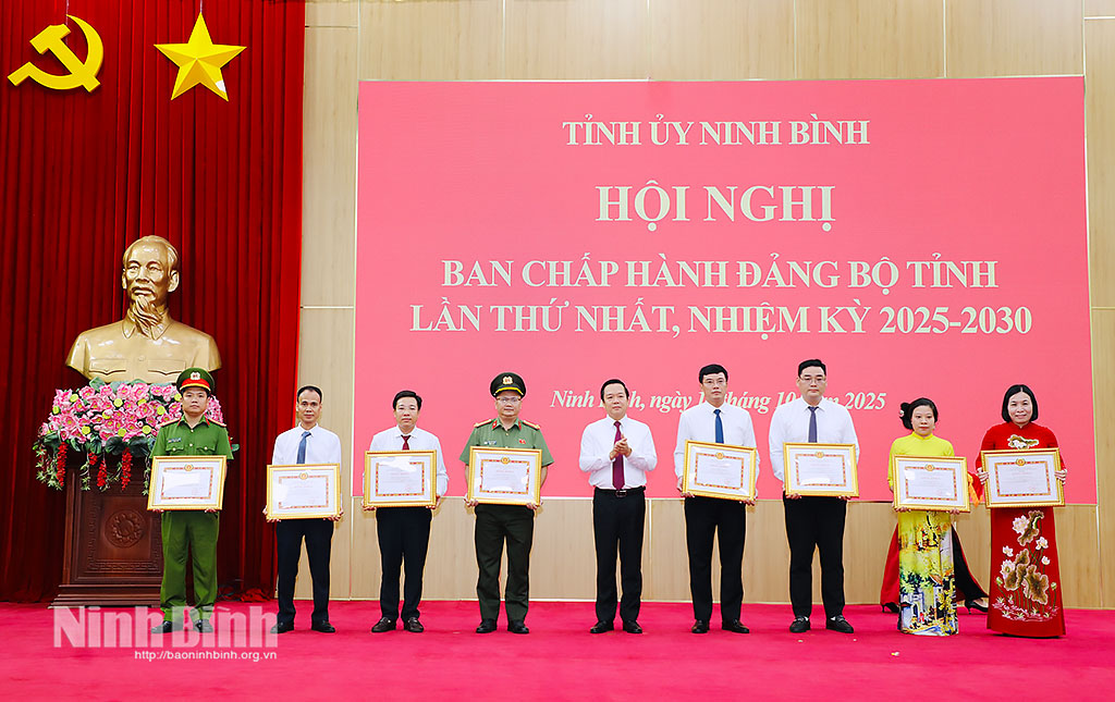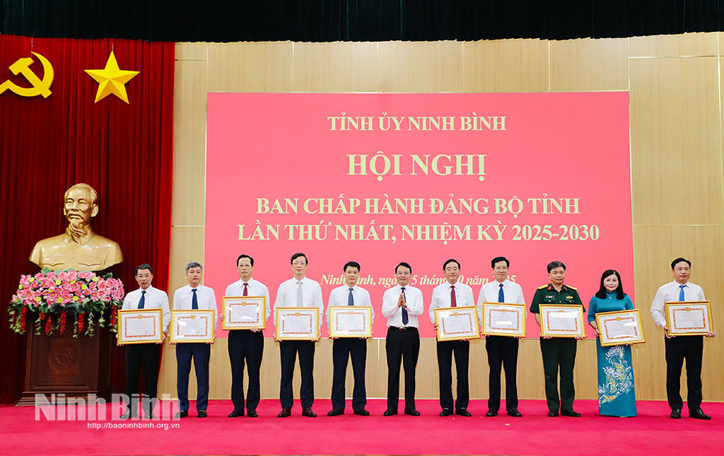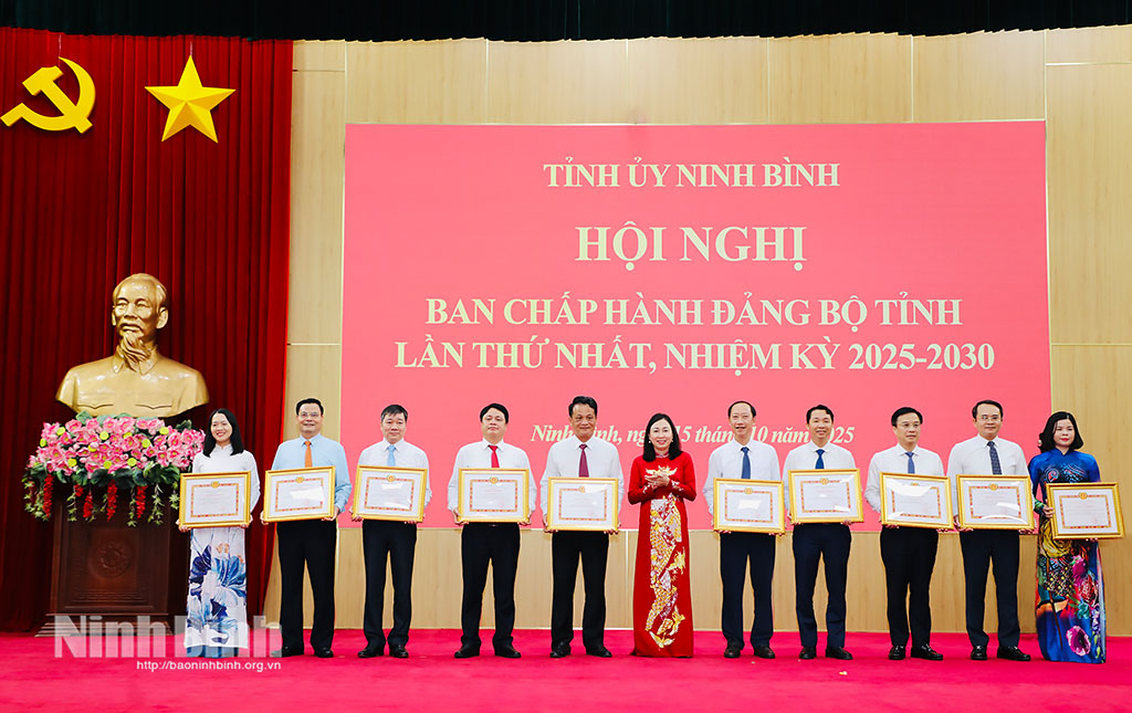 Tại hội nghị, Ban Thường vụ Tỉnh ủy đã tặng Bằng khen cho 21 tổ chức đảng, 50 đảng viên có thành tích xuất sắc trong công tác tham mưu tổ chức Đại hội Đại biểu Đảng bộ tỉnh Ninh Bình lần thứ I, nhiệm kỳ 2025-2030.