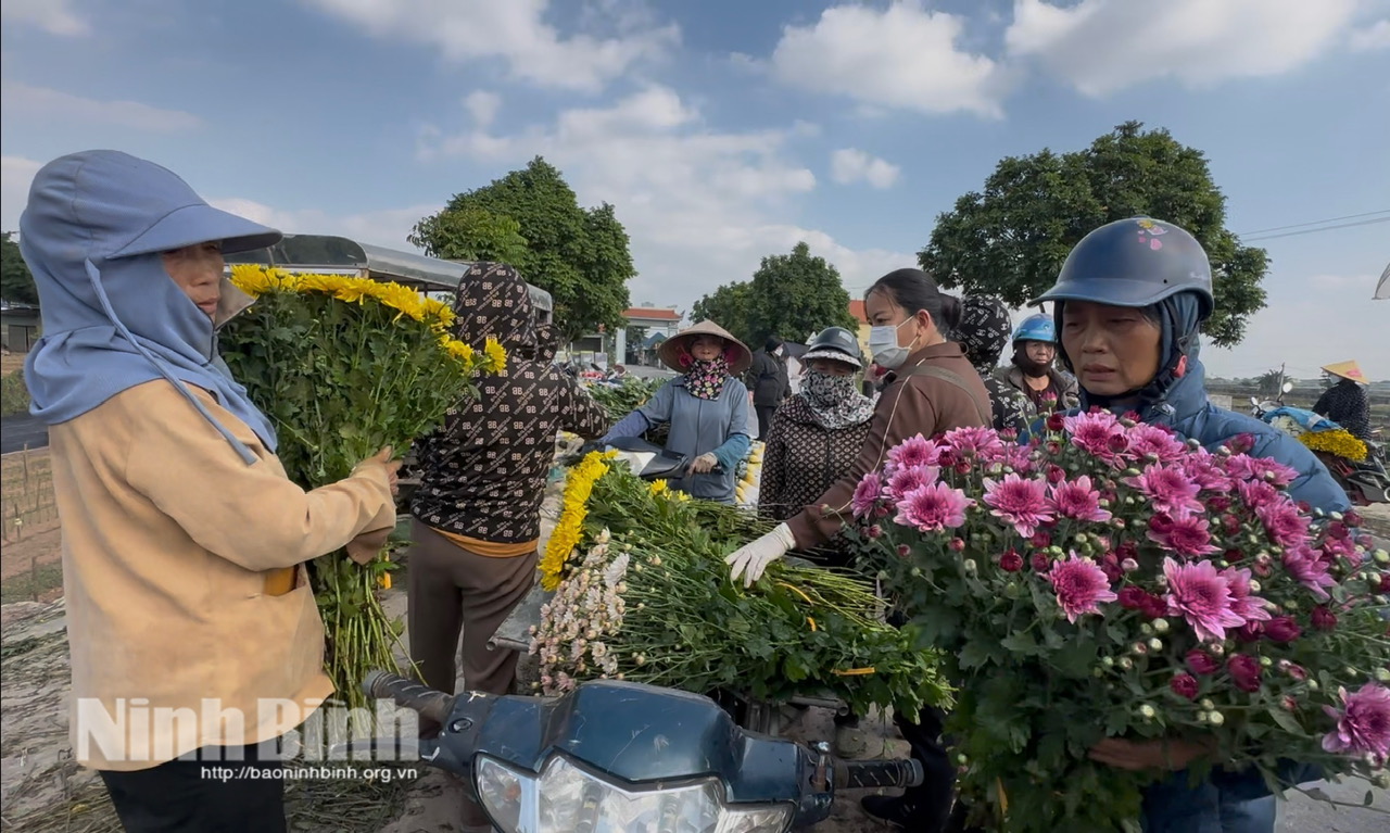 Vừa nhanh tay chằng gọn những bó cúc còn ướt đẫm sương đêm, chị Trương Thị Hiền (xã Nhân Hà) - một khách quen của chợ vừa hồ hởi chia sẻ giữa tiếng ồn ào náo nhiệt: “Dịp ngày tuần, rằm, mồng một hay cuối năm, nhu cầu tiêu thụ hoa tăng mạnh nên tôi thường xuyên sang làng hoa Hồng Hà để nhập hàng. Hoa ở đây có tiếng là tươi, bông to, đẹp và rất bền màu, lấy về bán lẻ cho các đầu mối ở quê thì không bao giờ lo ế”.