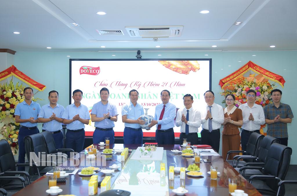 Tại Công ty Cổ phần Thực phẩm xuất khẩu Đồng Giao (DOVECO), đồng chí Phó Bí thư Tỉnh ủy, Chủ tịch Ủy ban MTTQ Việt Nam tỉnh đã gửi lời chúc mừng tập thể cán bộ, người lao động nhân ngày Doanh nhân Việt Nam; đồng thời ghi nhận, biểu dương những đóng góp quan trọng của công ty đối với sự phát triển kinh tế - xã hội của tỉnh.