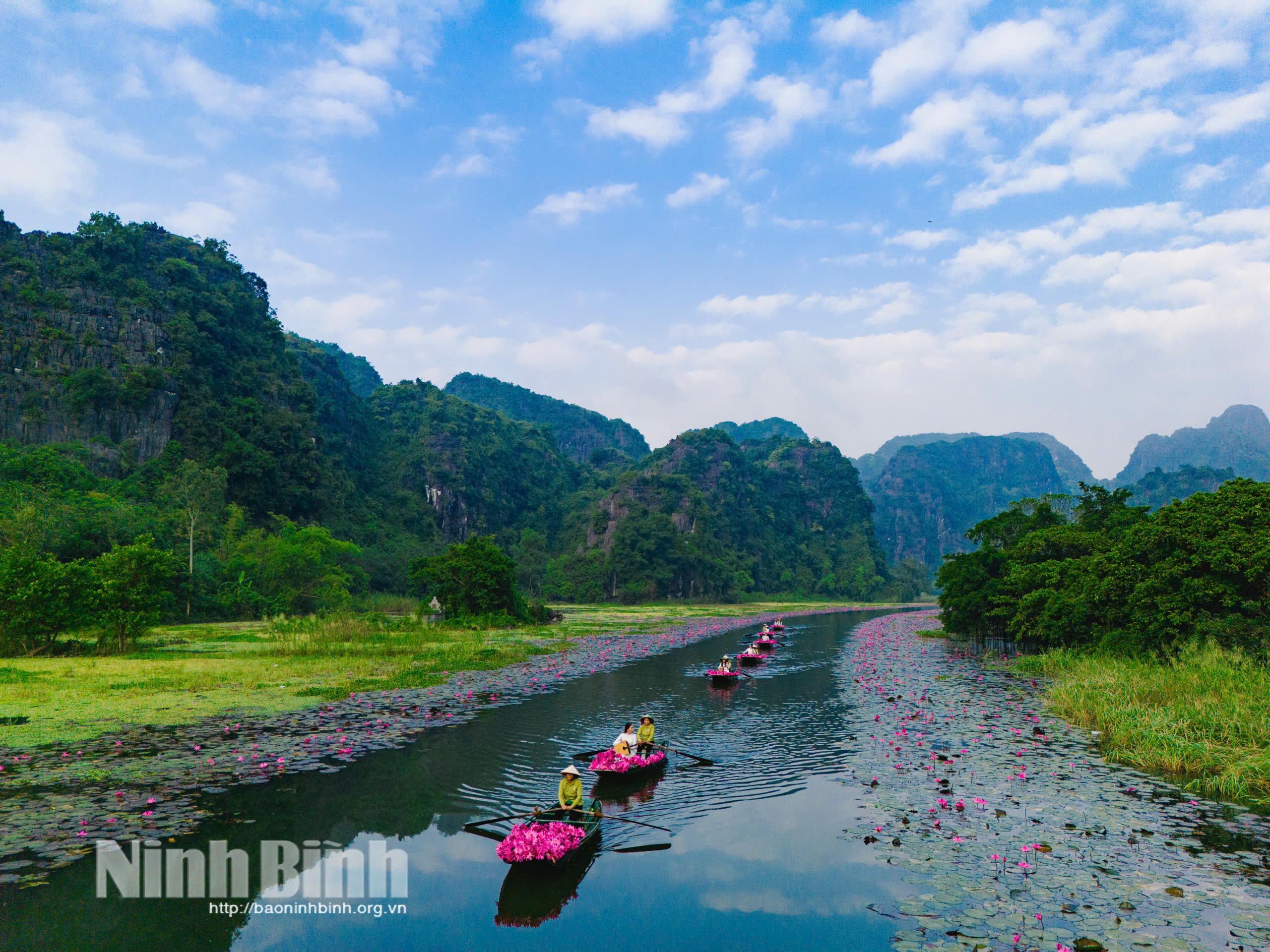Khi dòng Ngô Đồng phủ sắc tím mơ màng của hoa súng, Khu du lịch Tam Cốc -Bích Động lại trở nên duyên dáng đến lạ. Mặt nước bảng lảng sương sớm, những cánh hoa khẽ chạm mũi thuyền, phản chiếu lên vách núi đá vôi hùng vĩ tạo nên khung cảnh nên thơ hiếm nơi nào có được.
