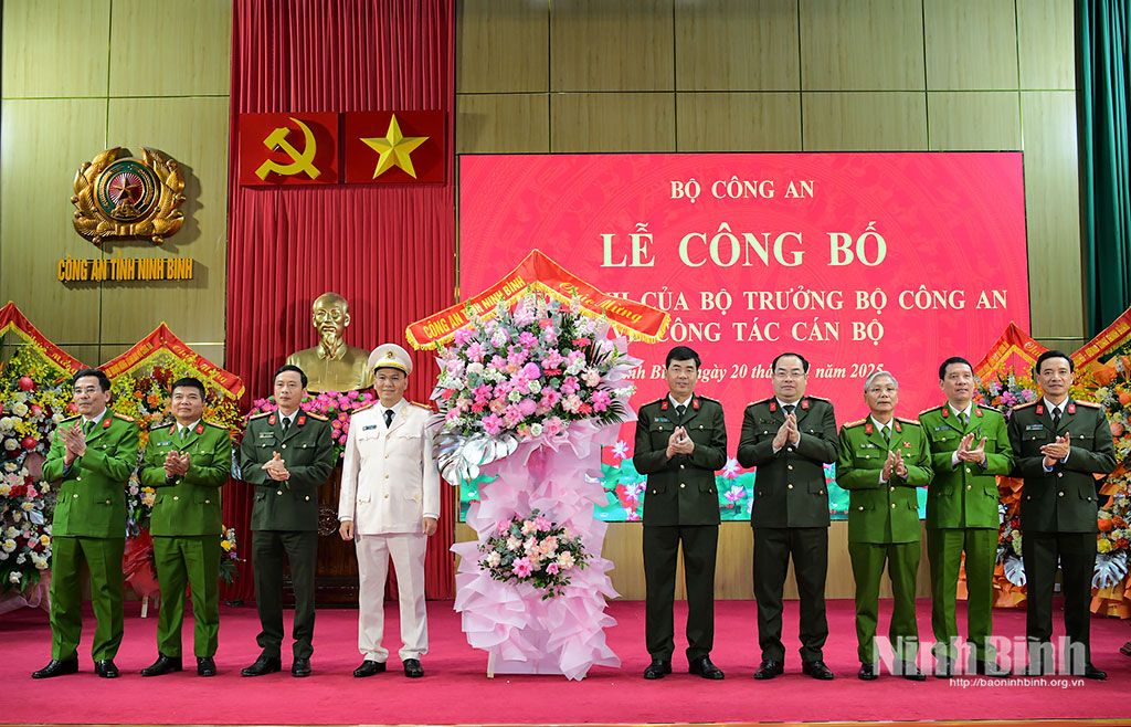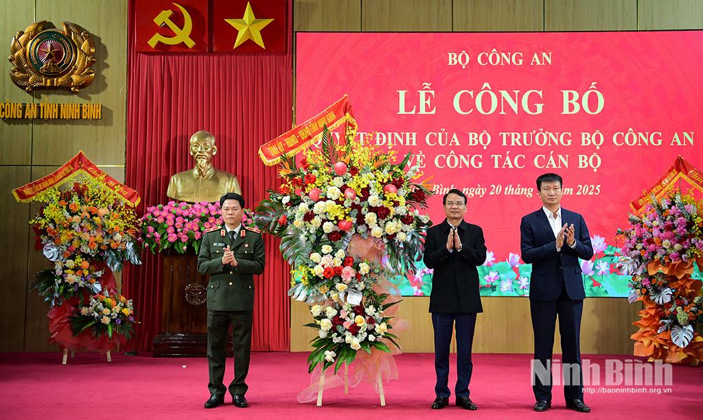 Chiều 20/11, tại Công an tỉnh Ninh Bình diễn ra Hội nghị công bố Quyết định của Bộ trưởng Bộ Công an về công tác cán bộ. Dự hội nghị có các đồng chí: Đặng Xuân Phong, Ủy viên Trung ương Đảng, Bí thư Tỉnh ủy, Trưởng Đoàn đại biểu Quốc hội tỉnh; Thượng tướng Nguyễn Ngọc Lâm, Ủy viên Ban Thường vụ Đảng ủy Công an Trung ương, Thứ trưởng Bộ Công an; Trần Huy Tuấn, Phó Bí thư Tỉnh ủy, Chủ tịch UBND tỉnh. Dự hội nghị có các đồng chí lãnh đạo các Cục nghiệp vụ và cơ quan thuộc Bộ Công an; lãnh đạo Công an tỉnh Quảng Ninh, Công an tỉnh Ninh Bình; đại diện một số sở, ban, ngành hữu quan của tỉnh.