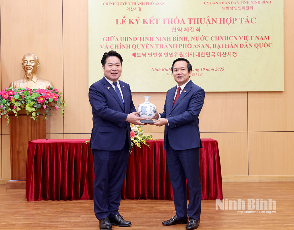 Ngày 31/10, tại trụ sở UBND tỉnh Ninh Bình đã diễn ra Hội đàm cấp cao và Lễ ký kết Thỏa thuận hợp tác giữa UBND tỉnh Ninh Bình và Chính quyền thành phố Asan, Hàn Quốc. Sự kiện này có ý nghĩa đặc biệt, diễn ra ngay sau khi tỉnh Ninh Bình mới được thành lập.