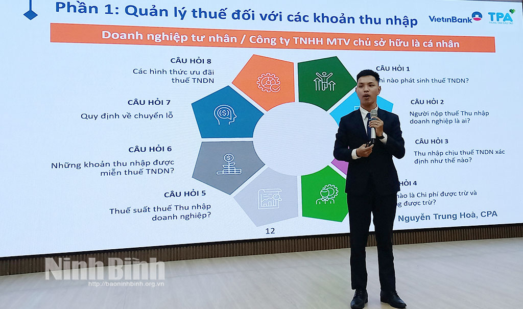 Nghị định số 70/2025/NĐ-CP có hiệu lực thi hành từ ngày 01/6/2025. Nghị định quy định rõ hơn về việc sử dụng hóa đơn điện tử, kê khai thuế, quản lý kế toán đối với các mô hình kinh doanh nhỏ lẻ. Hội nghị là dịp để các khách hàng của Ngân hàng TMCP Công thương Việt Nam - Chi nhánh Ninh Bình trao đổi, lắng nghe quy định về chính sách thuế, tài chính mới; từ đó giúp nâng cao hiểu biết pháp luật, xây dựng giải pháp kinh doanh mới và quản lý tài chính cá nhân hiệu quả hơn.