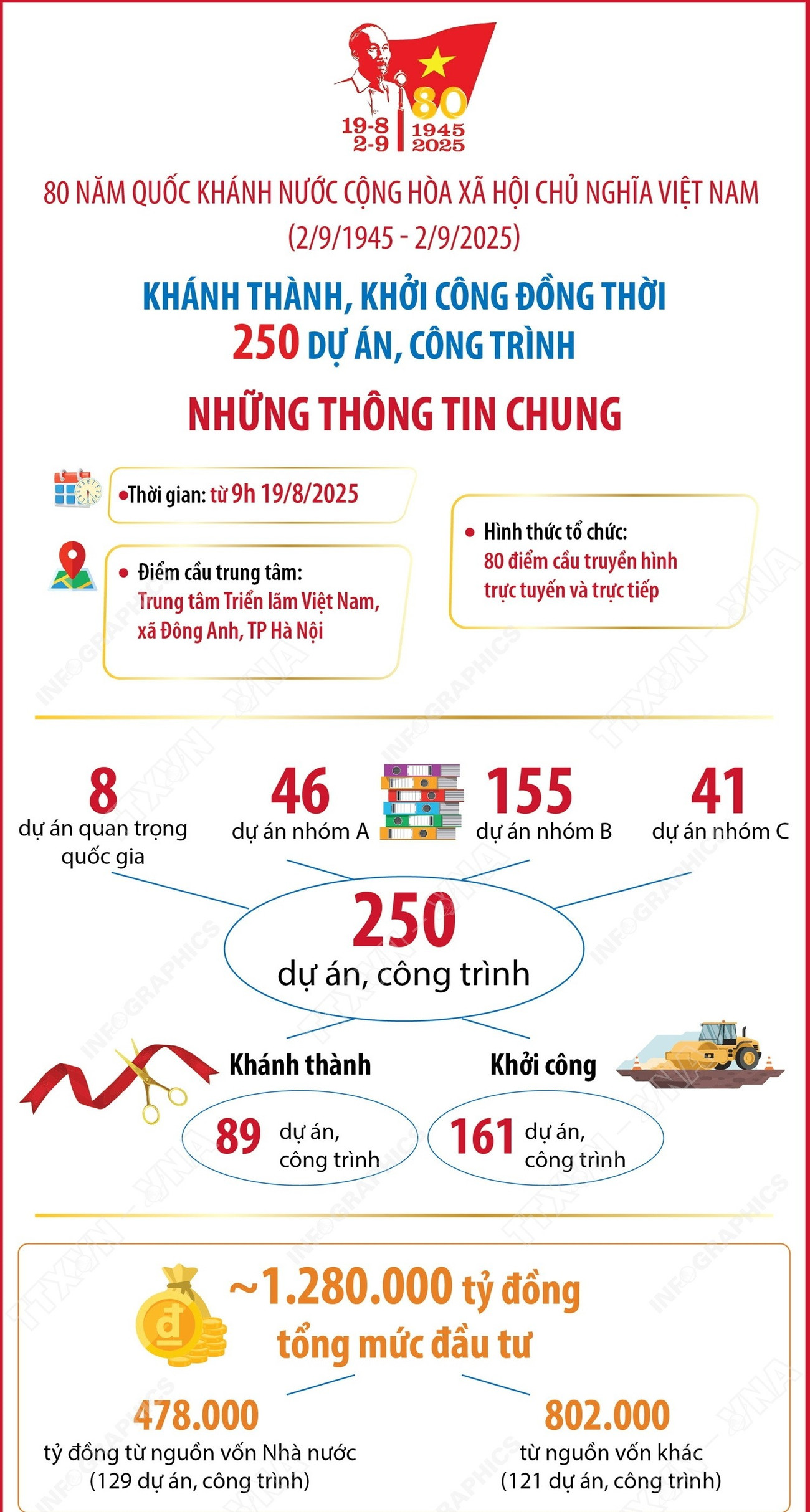 250 dự án, công trình chào mừng kỷ niệm 80 năm Quốc khánh 2/9 có tổng mức đầu tư 1,28 triệu tỷ đồng, trong đó có 89 dự án, công trình khánh thành; 161 dự án, công trình khởi công.