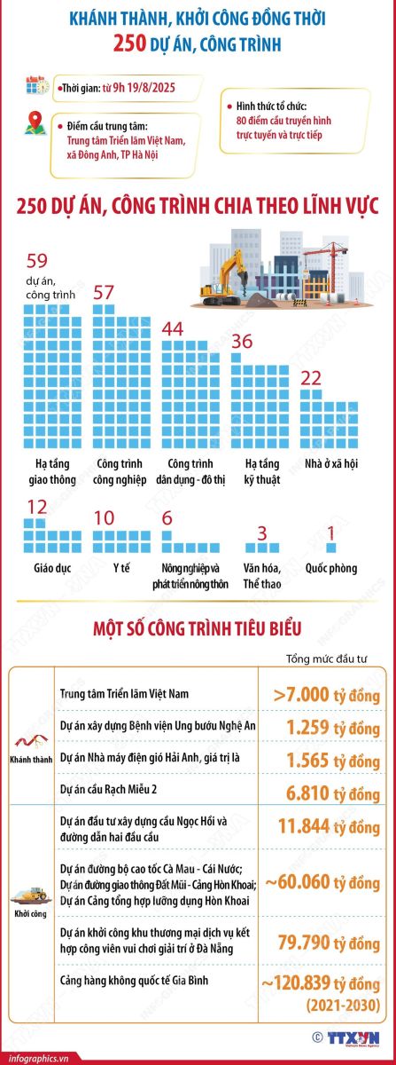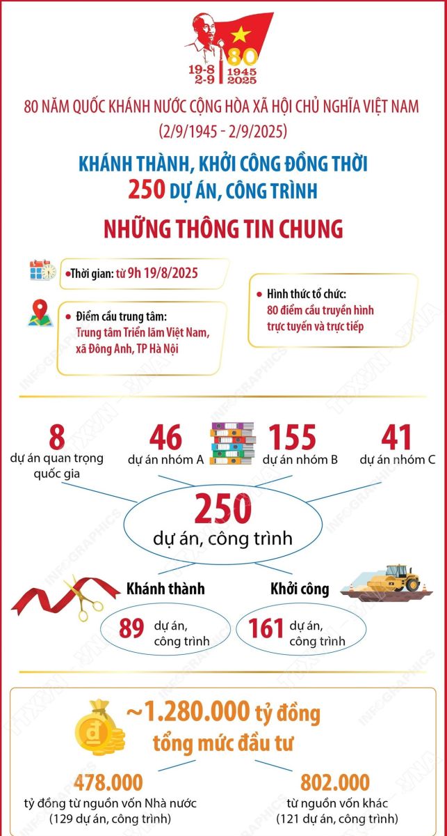 Chào mừng kỷ niệm 80 năm Quốc khánh (2/9/1945-2/9/2025), vào 9 giờ sáng nay (19/8), Lễ khánh thành, khởi công 250 dự án, công trình được tổ chức đồng loạt. 250 dự án, công trình này có tổng mức đầu tư 1,28 triệu tỷ đồng, trong đó có 89 dự án, công trình khánh thành; 161 dự án, công trình khởi công.