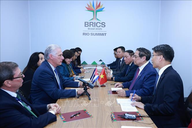 Nhân dịp tham dự Hội nghị Thượng đỉnh Nhóm các nền kinh tế mới nổi (BRICS) mở rộng năm 2025 tại thành phố Rio de Janeiro (Brazil), chiều 6/7/2025, giờ địa phương (rạng sáng 7/7, giờ Hà Nội), Thủ tướng Phạm Minh Chính gặp Bí thư Thứ nhất Đảng Cộng sản Cuba, Chủ tịch nước Cộng hòa Cuba Miguel Díaz-Canel Bermúdez. Ảnh: Dương Giang-TTXVN