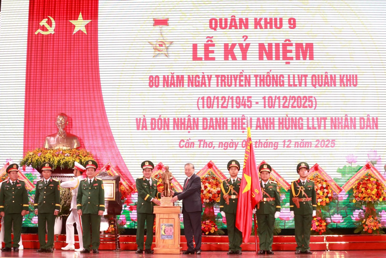 (ĐCSVN) – Sáng 8/12, tại thành phố Cần Thơ, Đảng ủy, Bộ Tư lệnh Quân khu 9 long trọng tổ chức lễ kỷ niệm 80 năm ngày truyền thống Lực lượng vũ trang (LLVT) Quân khu 9 (10/12/1945 - 10/12/2025) và đón nhận danh hiệu Đơn vị Anh hùng Lực lượng vũ trang Nhân dân. Tổng Bí thư Tô Lâm, Bí thư Quân ủy Trung ương dự và phát biểu chỉ đạo .