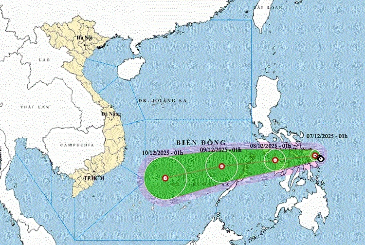 Đến 1 giờ ngày 9/12, áp thấp nhiệt đới tiếp tục hướng Tây Tây Nam nhanh hơn, khoảng 20 km/giờ, tiến vào vùng biển phía Đông giữa Biển Đông, cách đảo Song Tử Tây 350 km về phía Đông Đông Nam; vùng nguy hiểm nằm trong khoảng 10–13 độ Vĩ Bắc và phía Đông kinh tuyến 116,5 độ Kinh Đông. Cấp độ rủi ro thiên tai khu vực này ở mức 3.