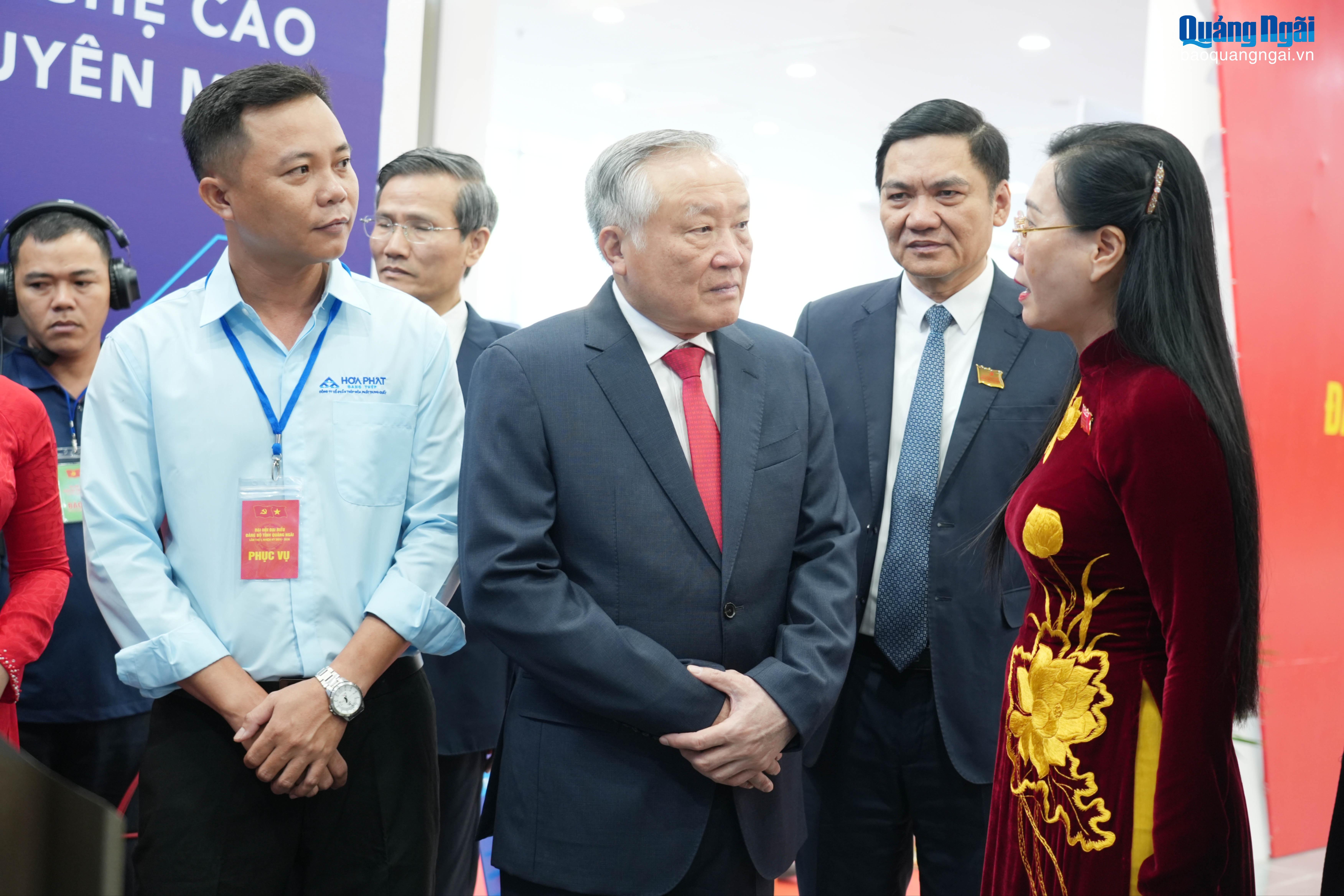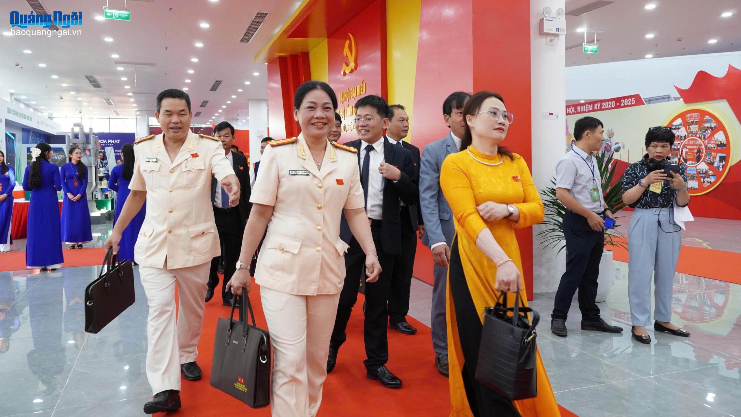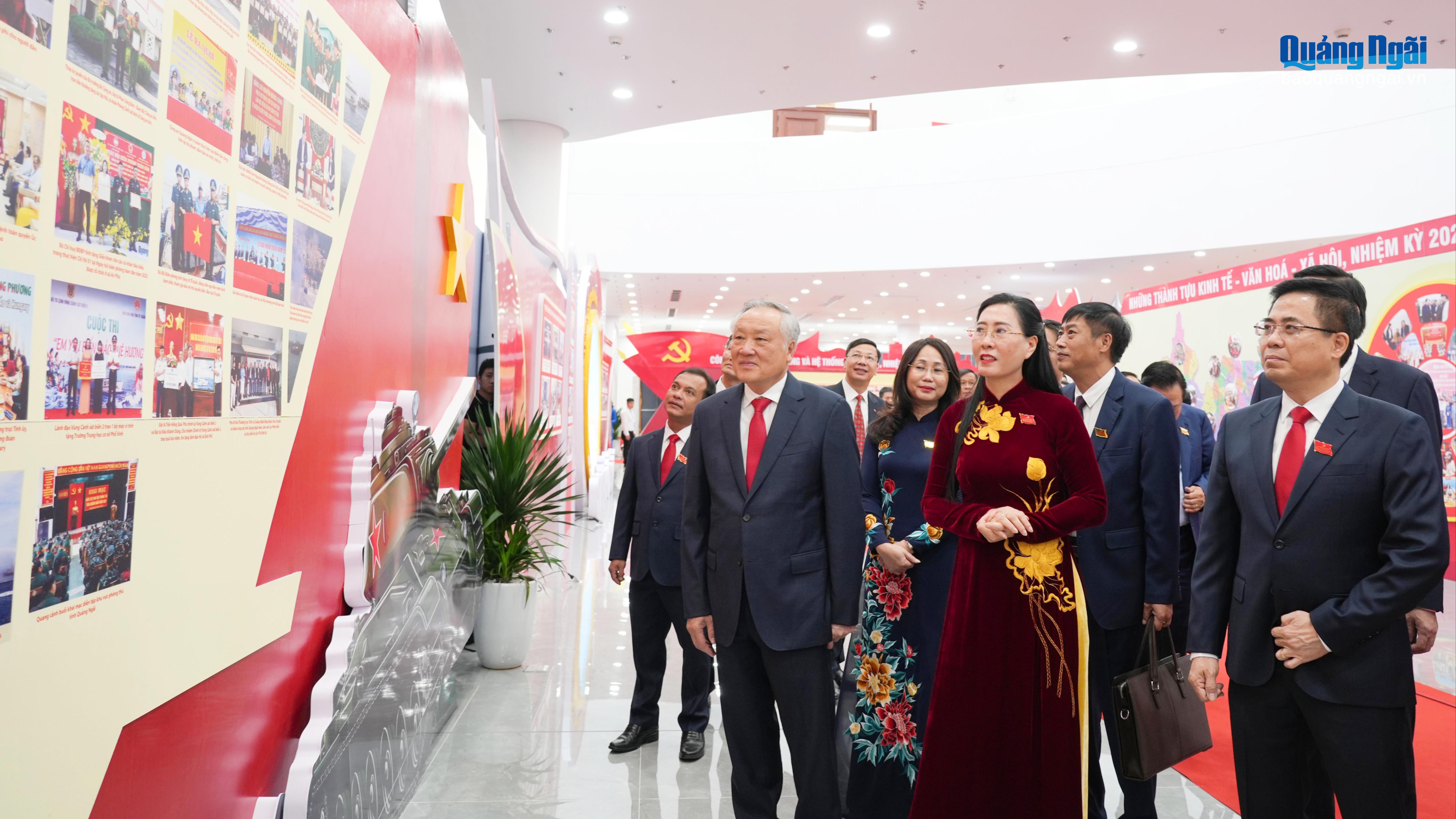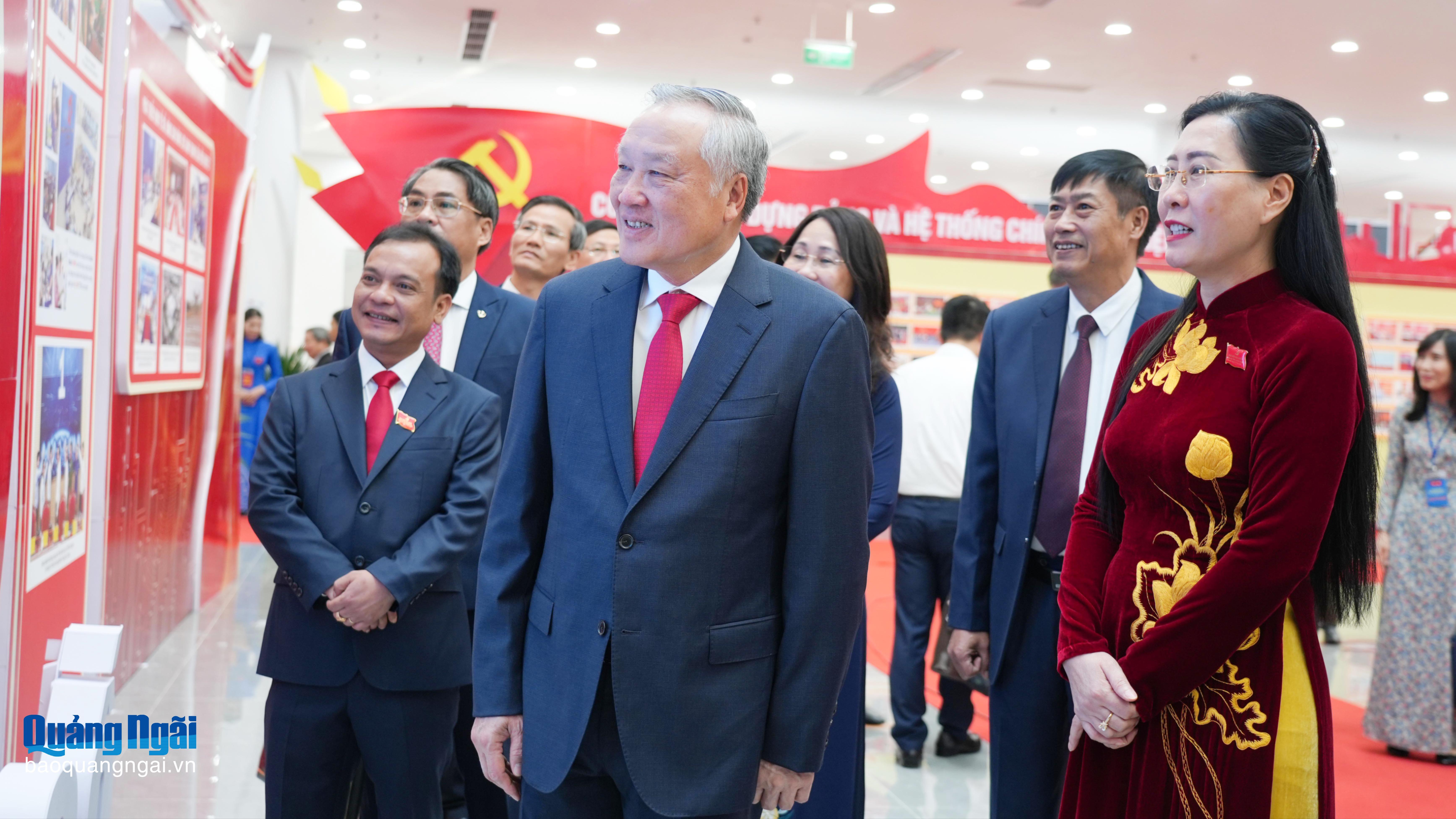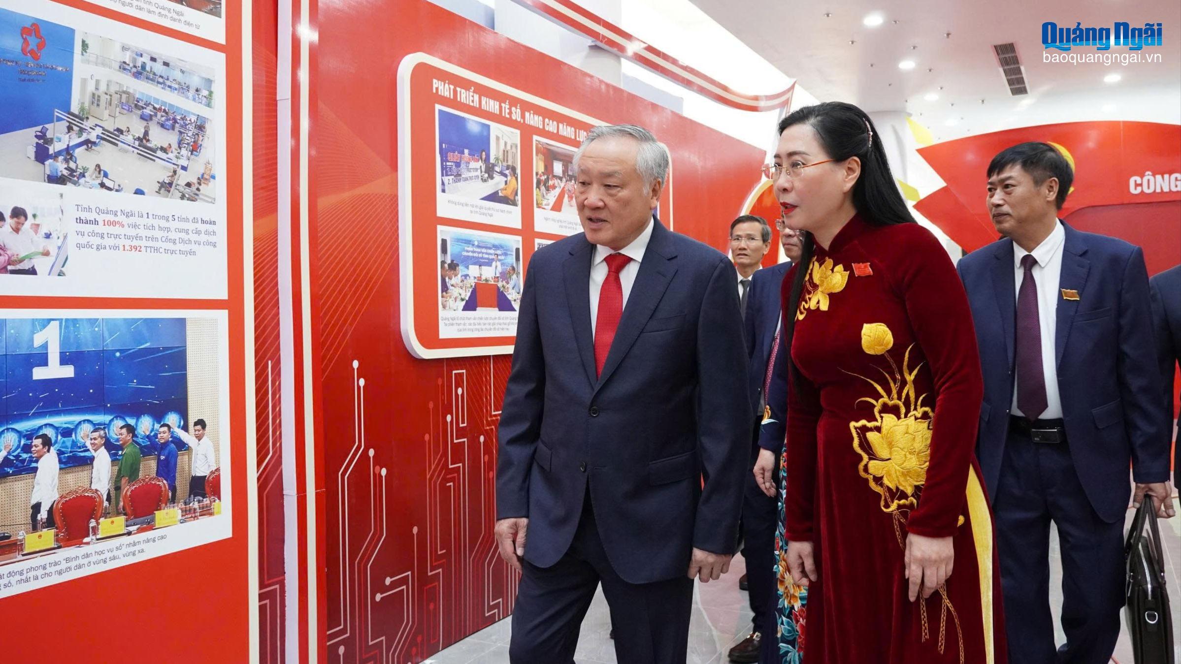 Ủy viên Bộ Chính trị, Phó Thủ tướng Thường trực Chính phủ Nguyễn Hòa Bình; Ủy viên Trung ương Đảng, Bí thư Tỉnh ủy Bùi Thị Quỳnh Vân và các đồng chí lãnh đạo tỉnh tham quan hình ảnh trưng bày tại đại hội.