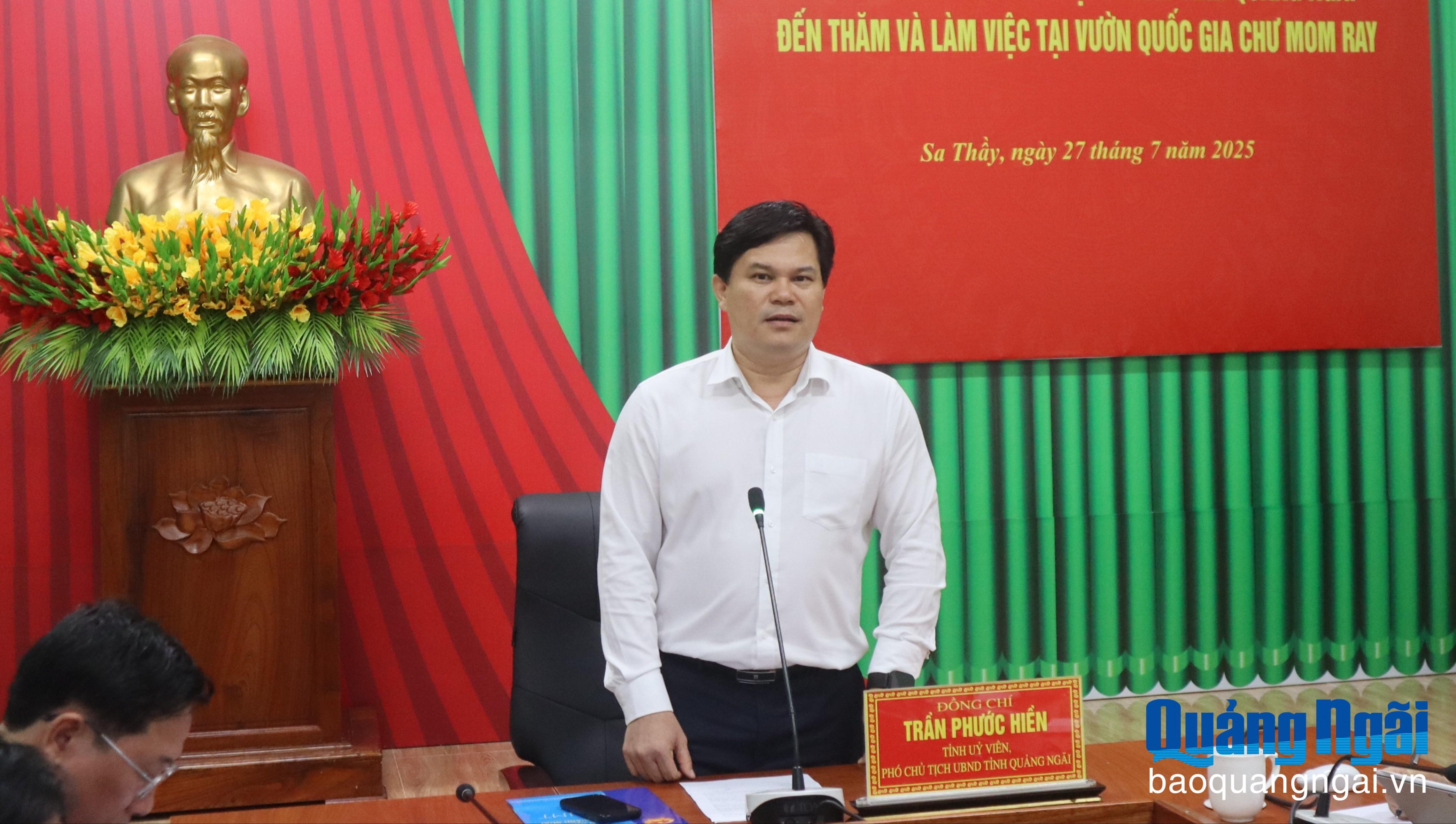 (Baoquangngai.vn)- Phát biểu chỉ đạo tại buổi làm việc, Phó Chủ tịch UBND tỉnh Trần Phước Hiền đề nghị Ban Quản lý Vườn Quốc gia Chư Mom Ray cần nghiên cứu đẩy mạnh phát triển du lịch sinh thái gắn với phát triển rừng bền vững.