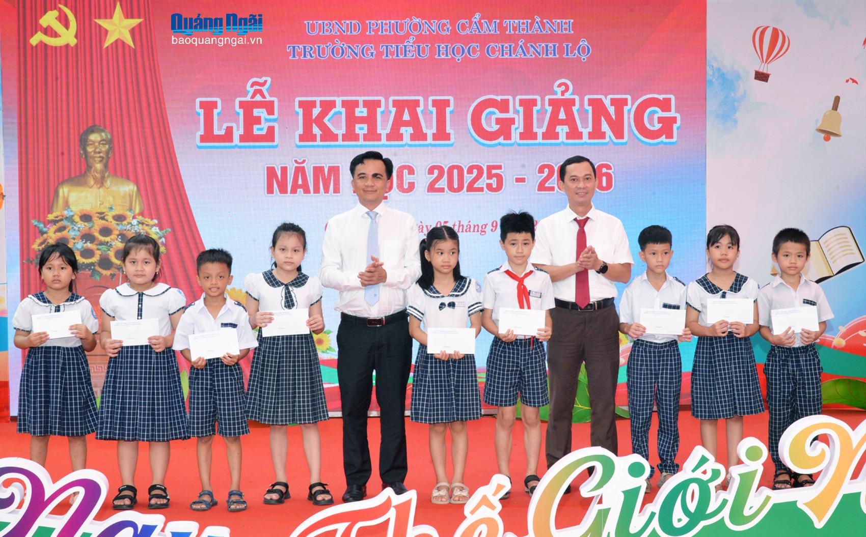 Dịp này, UBND phường Cẩm Thành đã trao 8 suất học bổng “Tiếp sức đến trường” cho 8 học sinh, với mỗi suất trị giá 1 triệu đồng; nhà trường trao 15 suất quà cho học sinh có hoàn cảnh khó khăn nhằm động viên các em tiếp tục nỗ lực trong năm học mới.