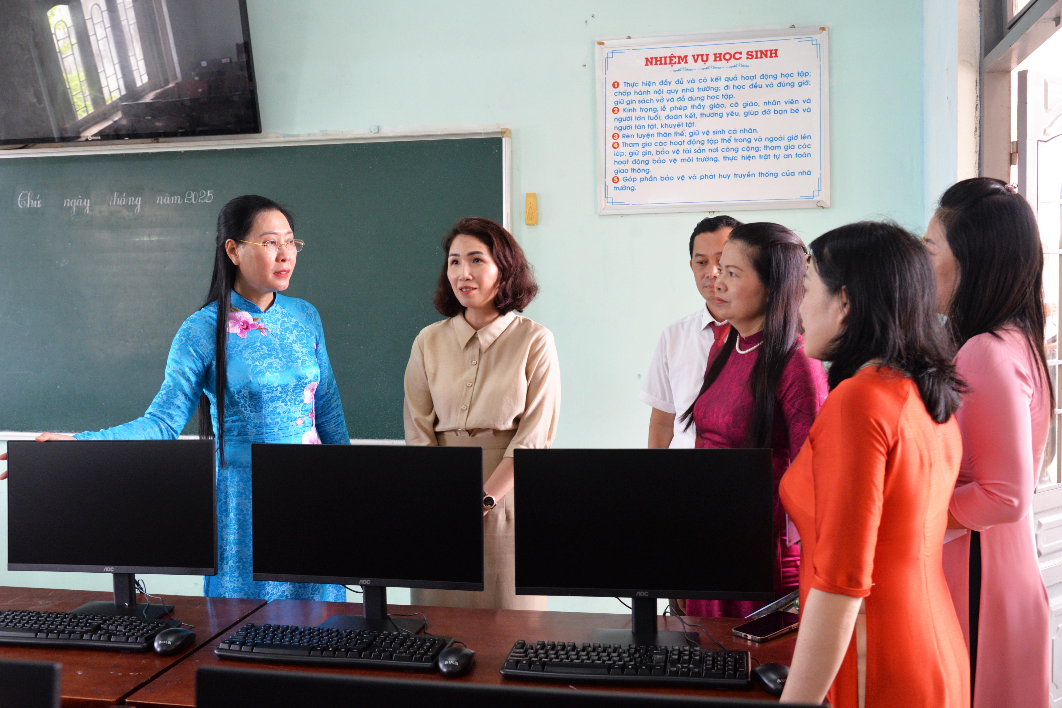 Ủy viên Trung ương Đảng, Bí thư Tỉnh ủy Bùi Thị Quỳnh Vân tham quan Phòng Tin học của Trường Tiểu học Chánh Lộ với dàn máy vi tính mới, do Công ty CP Chế biến nông sản Sao Mai trao tặng.