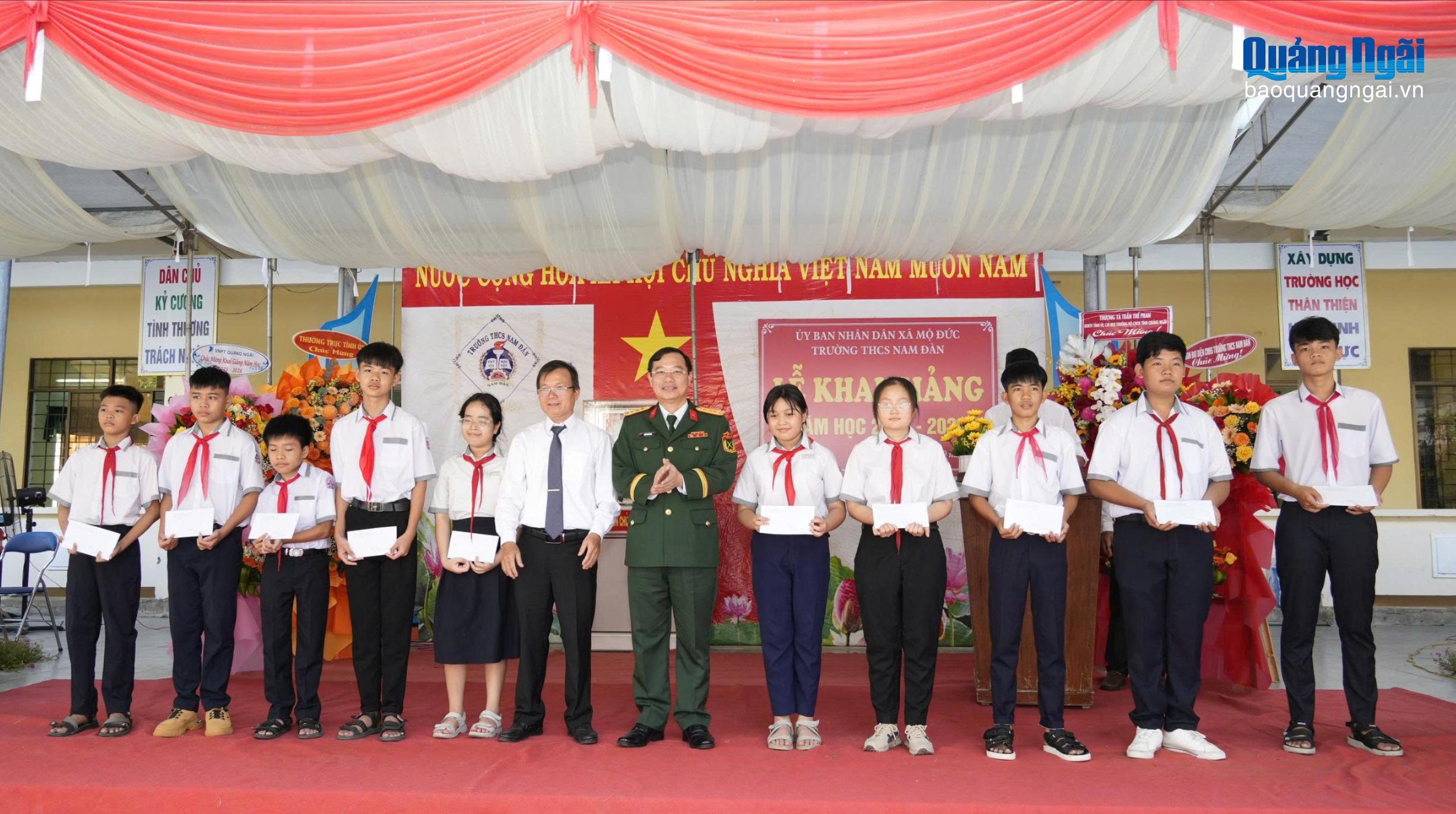 * Đến dự Lễ khai giảng cùng thầy và trò Trường THCS Nam Đàn, xã Mộ Đức, Thượng tá Trần Thế Phan - Ủy viên Ban Thường vụ Tỉnh ủy, Chỉ huy trưởng Bộ CHQS tỉnh chúc nhà trường đạt được nhiều thành tích trong năm học mới và trao học bổng cho học sinh nghèo học giỏi.