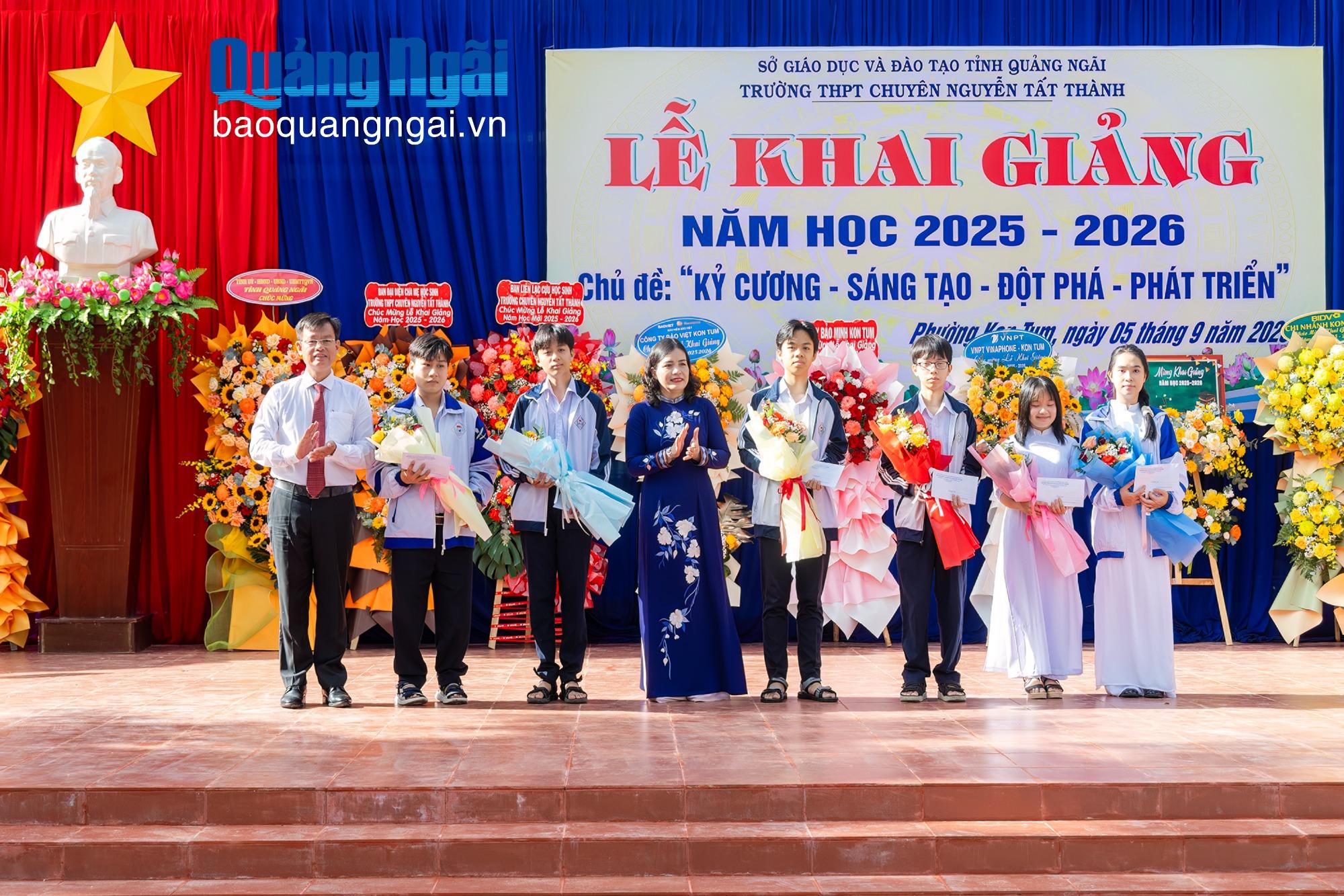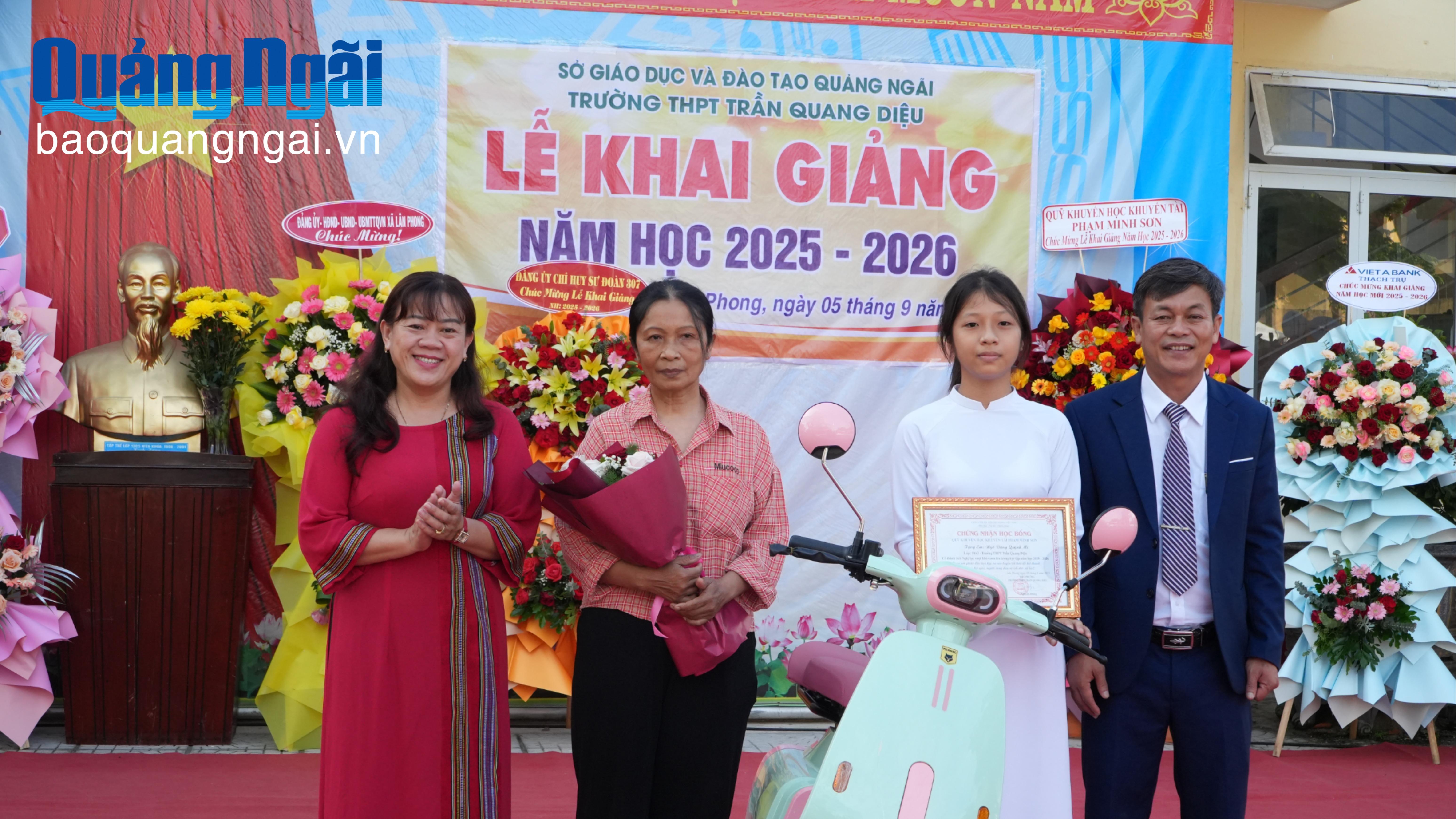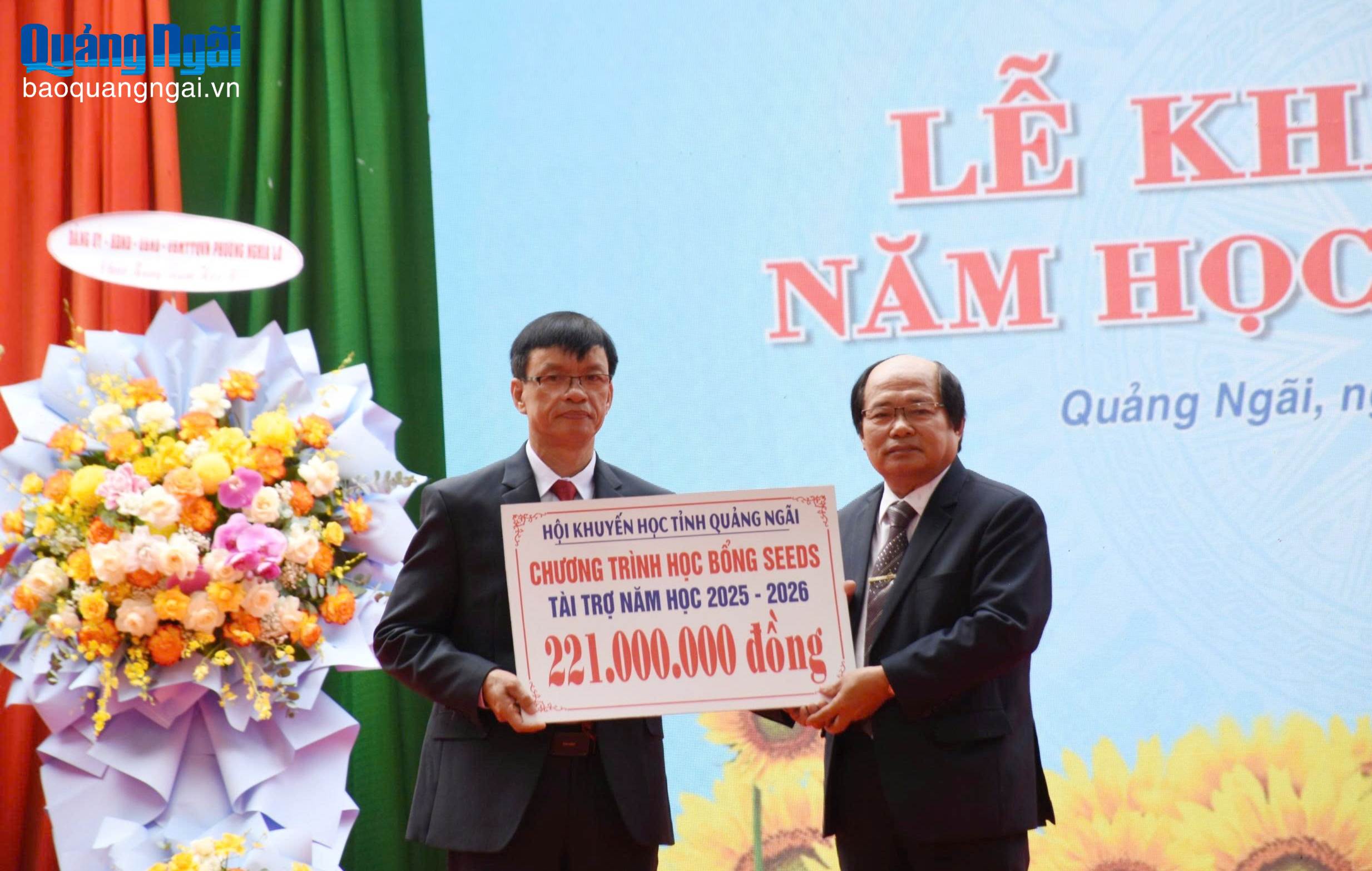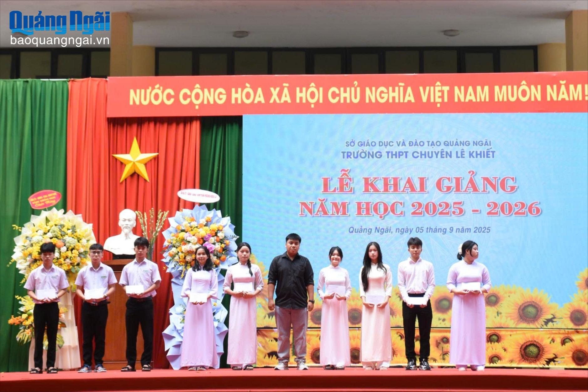 Trong khuôn khổ lễ khai giảng, Phó Chủ tịch Thường trực Hội Khuyến học tỉnh Trần Đức Minh đã trao bảng tượng trưng Chương trình học bổng SEEDS tài trợ năm học 2025 - 2026 với trị giá 221 triệu đồng cho nhà trường. Vietcombank Quảng Ngãi trao tặng 12 suất học bổng, với tổng trị giá 12 triệu đồng; các cựu học sinh Trường THPT Chuyên Lê Khiết trao 34 suất học bổng, với tổng trị giá 41 triệu đồng cho các học sinh có thành tích học tập tốt và học sinh có hoàn cảnh khó khăn.