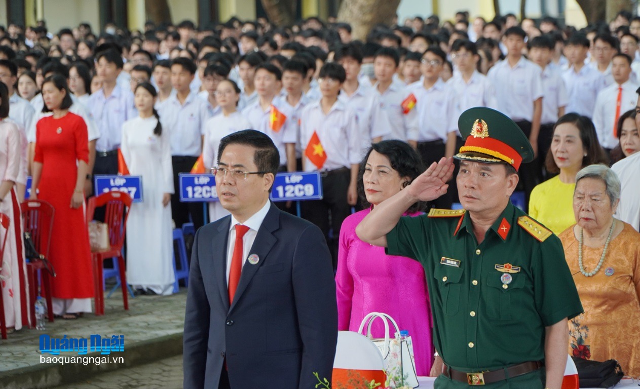 Phó Bí thư Tỉnh ủy, Chủ tịch UBND tỉnh Nguyễn Hoàng Giang cùng các đại biểu, thầy cô giáo, học sinh Trường THPT Trần Quốc Tuấn tham gia chào cờ, hát Quốc ca tại lễ khai giảng năm học mới cùng ngành Giáo dục cả nước.
