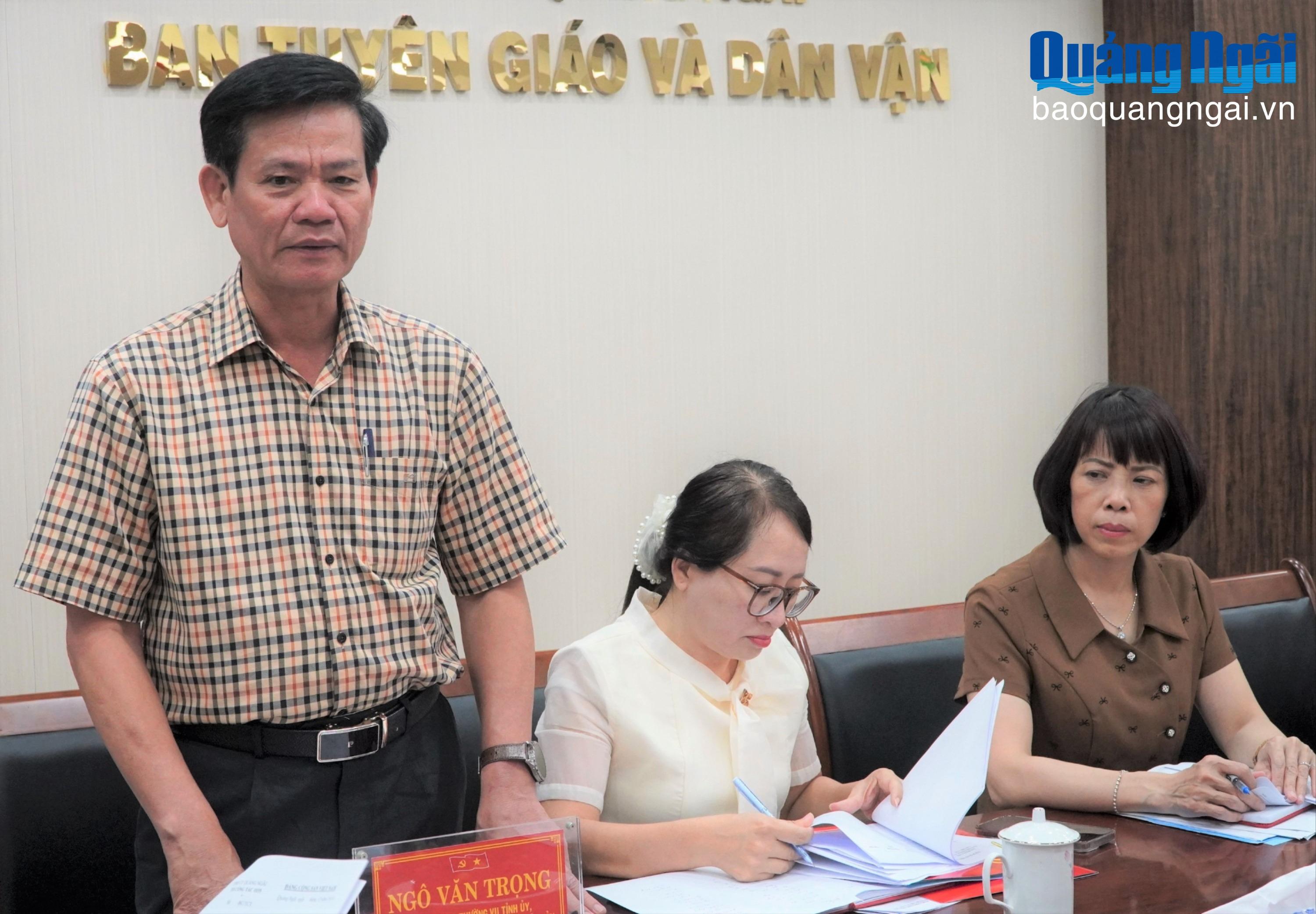 Ủy viên Ban Thường vụ Tỉnh ủy, Trưởng ban Tuyên giáo và Dân vận Tỉnh ủy Ngô Văn Trọng trao đổi tại buổi làm việc.