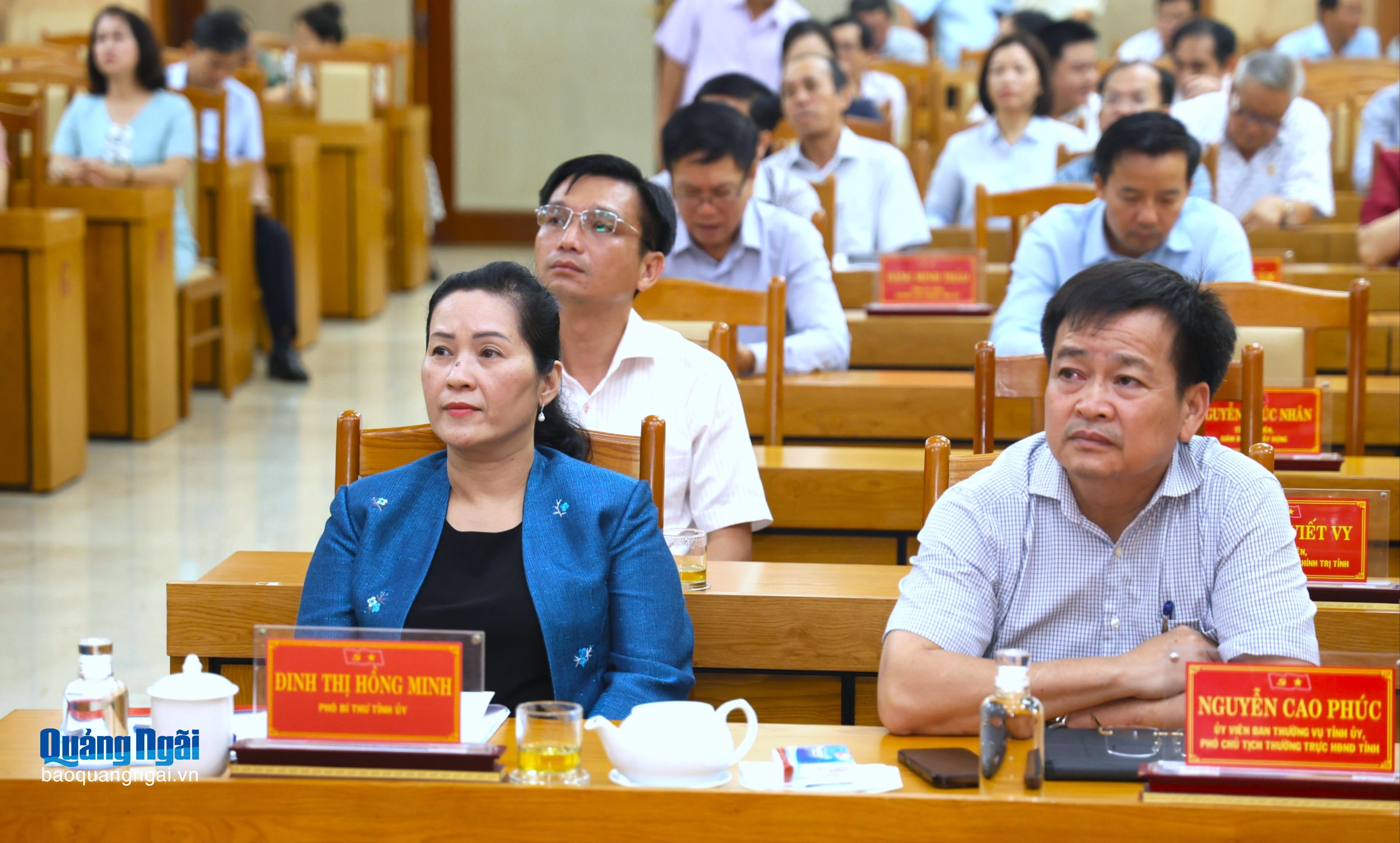 Ủy viên Trung ương Đảng, Bí thư Tỉnh ủy Bùi Thị Quỳnh Vân và các đại biểu dự hội nghị tại điểm cầu Tỉnh ủy Quảng Ngãi.