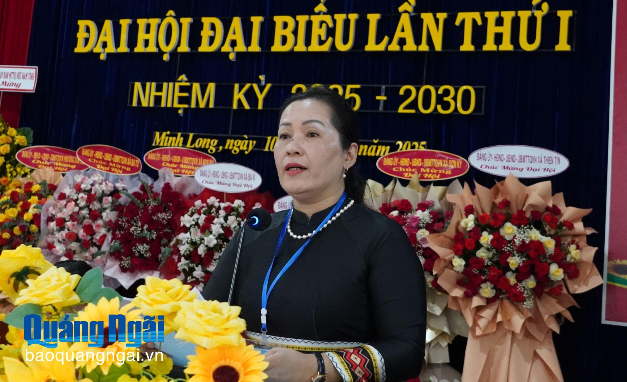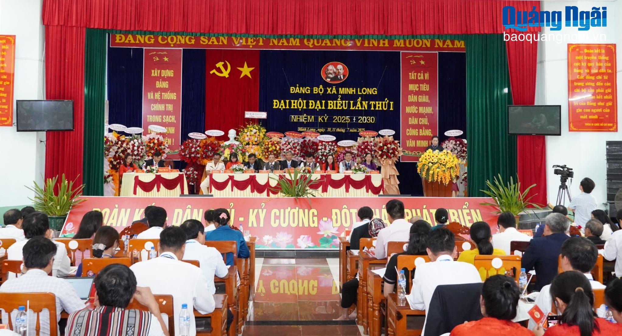 Phát biểu chỉ đạo tại đại hội, Phó Bí thư Tỉnh ủy Đinh Thị Hồng Minh biểu dương những thành tựu mà Đảng bộ, chính quyền, lực lượng vũ trang và nhân dân của xã Minh Long đạt được trong nhiệm kỳ qua; đồng thời nhấn mạnh, Đại hội đại biểu Đảng bộ xã Minh Long lần thứ I, nhiệm kỳ 2025 - 2030 là sự kiện chính trị quan trọng, có ý nghĩa lịch sử, đánh dấu một giai đoạn phát triển mới của xã Minh Long.