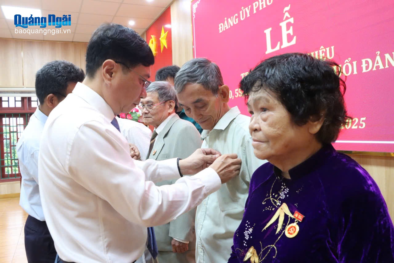 Bí thư Đảng ủy, Chủ tịch HĐND phường Nghĩa Lộ Trần Phước Hải trao Huy hiệu 50 năm tuổi Đảng cho các đảng viên.