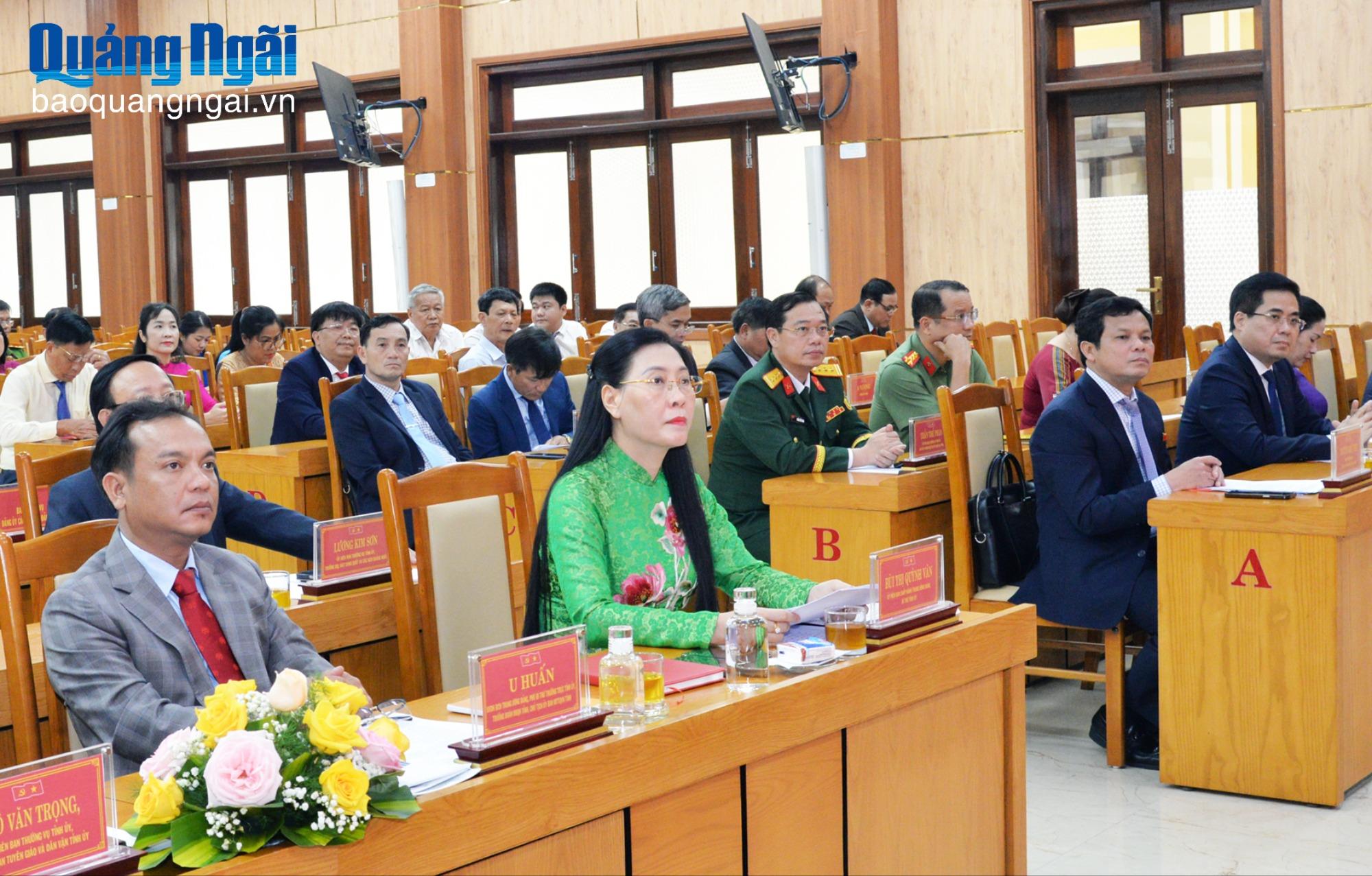 Phó Bí thư Tỉnh ủy Đinh Thị Hồng Minh trao quyết định và tặng hoa chúc mừng các đồng chí trong Ban Biên tập Báo và Phát thanh, Truyền hình Quảng Ngãi.
