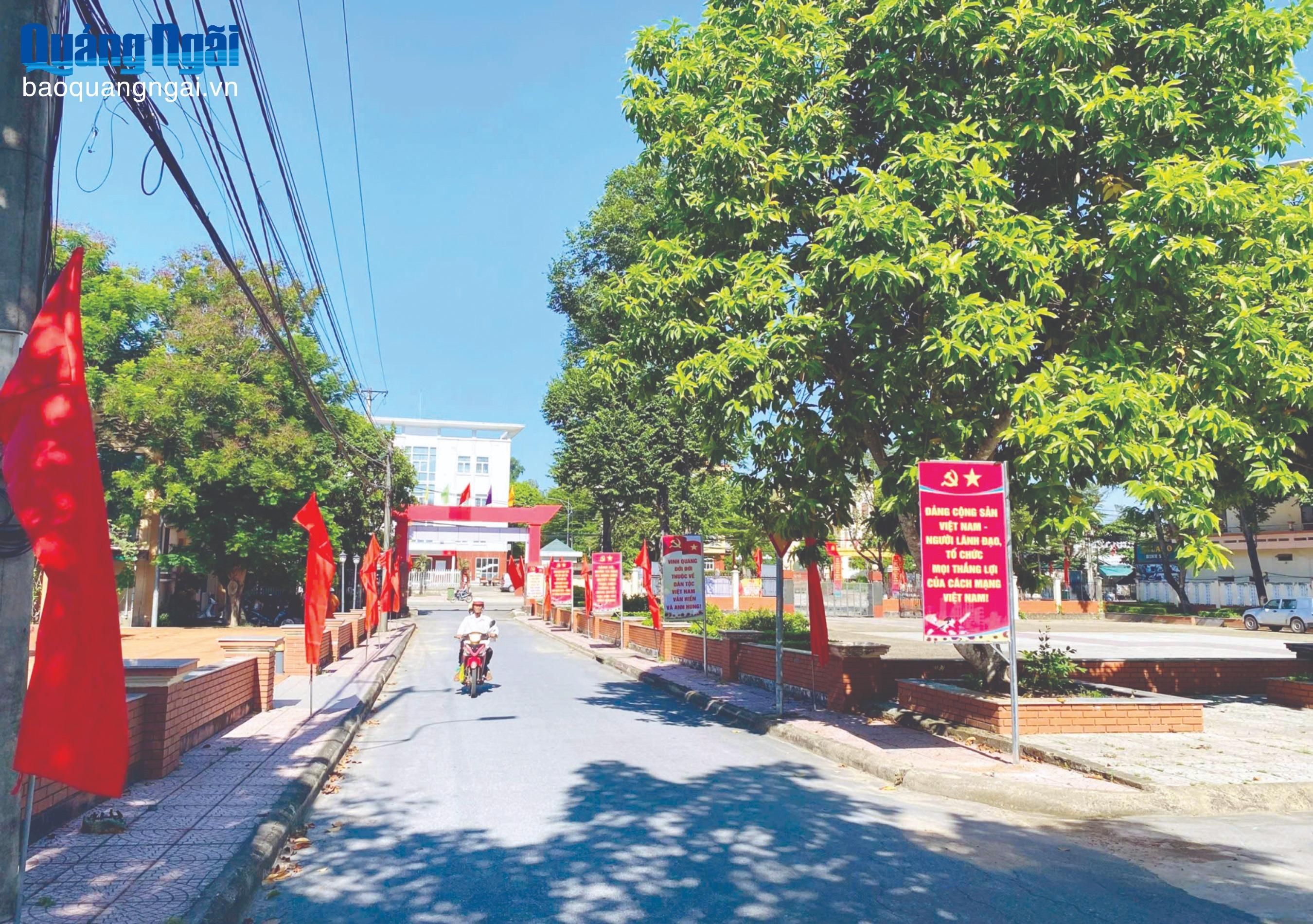 Xã Bình Sơn trang trí cờ, pa nô hướng đến Đại hội đại biểu Đảng bộ tỉnh lần thứ I, nhiệm kỳ 2025 - 2030. Ảnh: PV