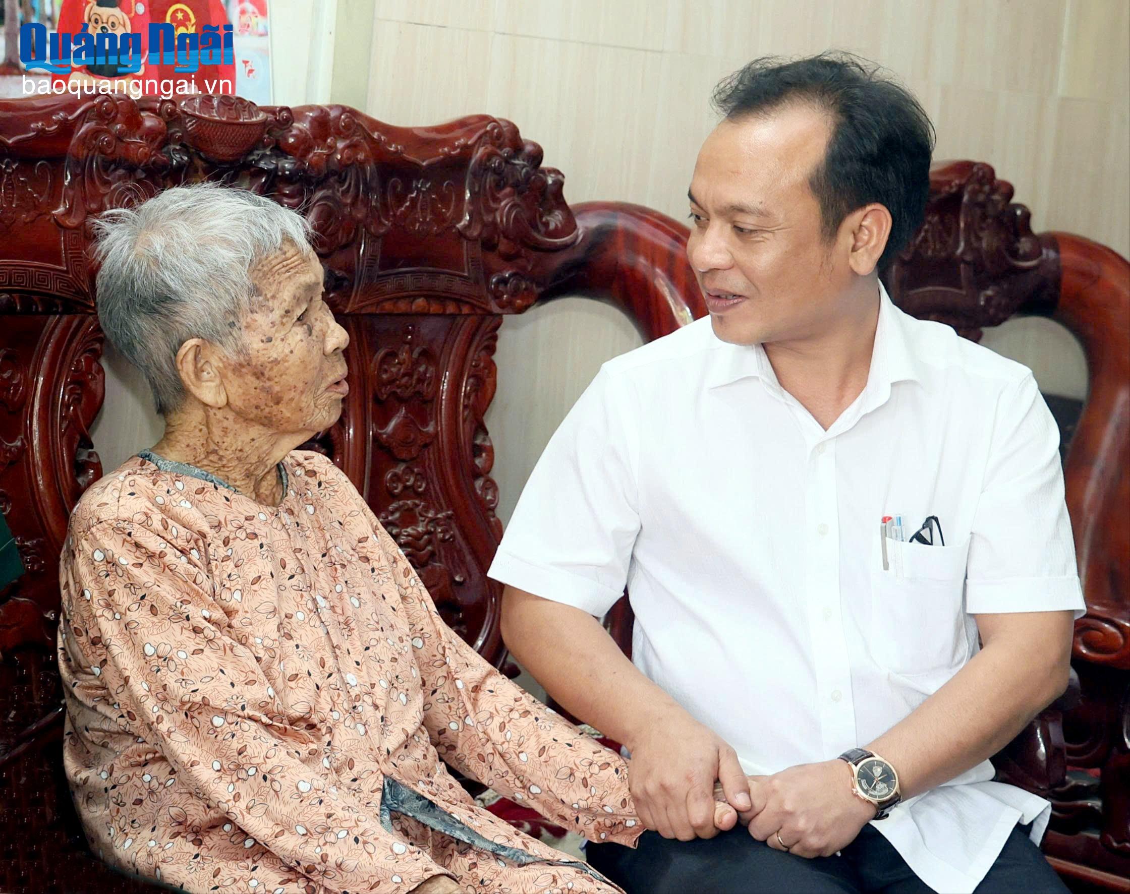 Ủy viên dự khuyết Trung ương Đảng, Phó Bí thư Thường trực Tỉnh ủy, Trưởng đoàn ĐBQH tỉnh, Chủ tịch Ủy ban MTTQ Việt Nam tỉnh U Huấn đến thăm, tặng quà Mẹ Việt Nam Anh hùng Phạm Thị Nhung, ở thôn Thượng Hòa, xã Vạn Tường. Ảnh: N.ĐỨC