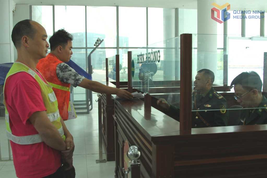 Cán bộ Đồn Biên phòng Cửa khẩu quốc tế Móng Cái làm thủ tục cho lái xe người Trung Quốc tại Cửa khẩu Bắc Luân 2.