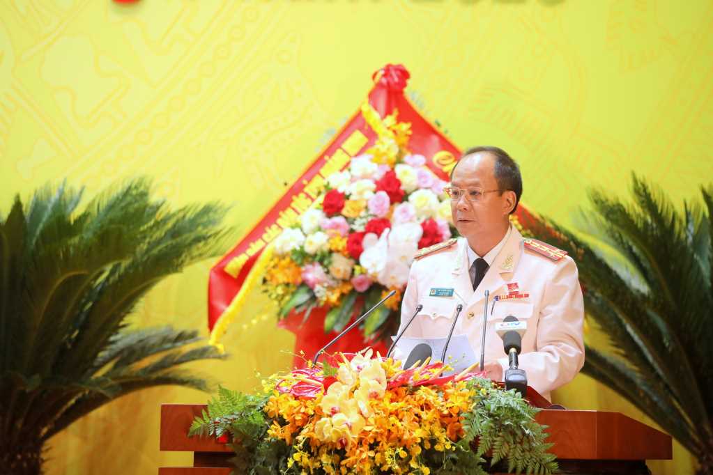 Đồng chí Vũ Thanh Tùng, Phó Giám đốc Công an tỉnh, tham luận về “Nâng cao năng lực, sức chiến đấu của Đảng bộ Công an tỉnh trong kỷ nguyên mới phục vụ phát triển kinh tế - xã hội trên địa bàn tỉnh Quảng Ninh.