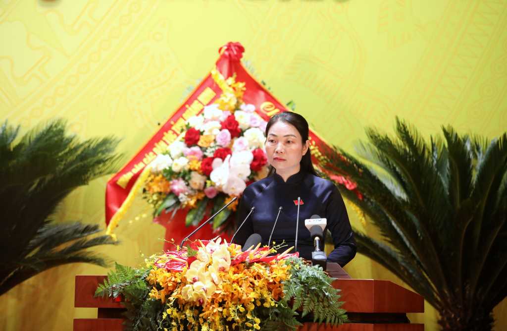 Đồng chí Vũ Thị Diệu Linh, Trưởng ban Văn hóa - Xã hội, HĐND tỉnh, tham luận về “Phát huy quyền làm chủ của nhân dân; nâng cao hiệu lực, hiệu quả hoạt động của HĐND tỉnh trong thể chế hóa, quyết định và giám sát thực hiện chính sách, pháp luật nhằm thực hiện thắng lợi các mục tiêu phát triển kinh tế - xã hội của tỉnh Quảng Ninh thời kỳ 2025-2030”.