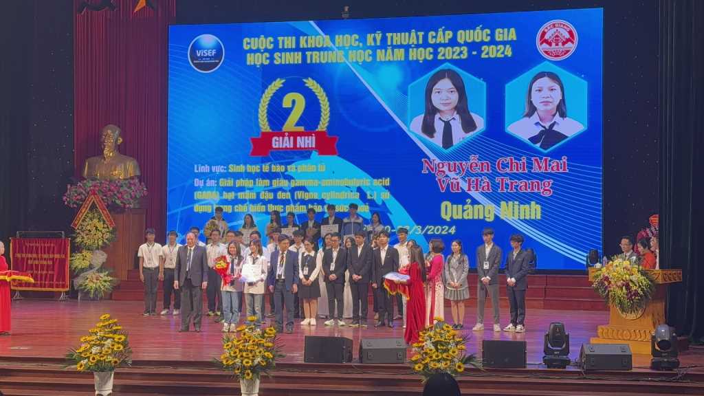 Vũ Hà Trang và Nguyễn Chi Mai (Trường THPT Chuyên Hạ Long) đoạt giải Nhì, Cuộc thi Khoa học, Kỹ thuật cấp quốc gia học sinh trung học năm học 2023-2024. Ảnh: Sở GD&ĐT cung cấp.