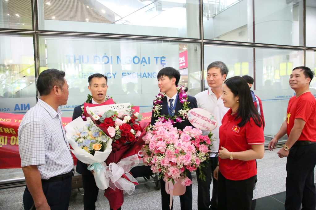 Lãnh đạo Sở GD&ĐT và các thầy cô chào đón và chúc mừng Ninh Quang Thắng trở về từ Bolivia với tấm Huy chương Đồng danh giá tại Kỳ thi Olympic Tin học Quốc tế (IOI) lần thứ 37. Ảnh: Minh Hà.