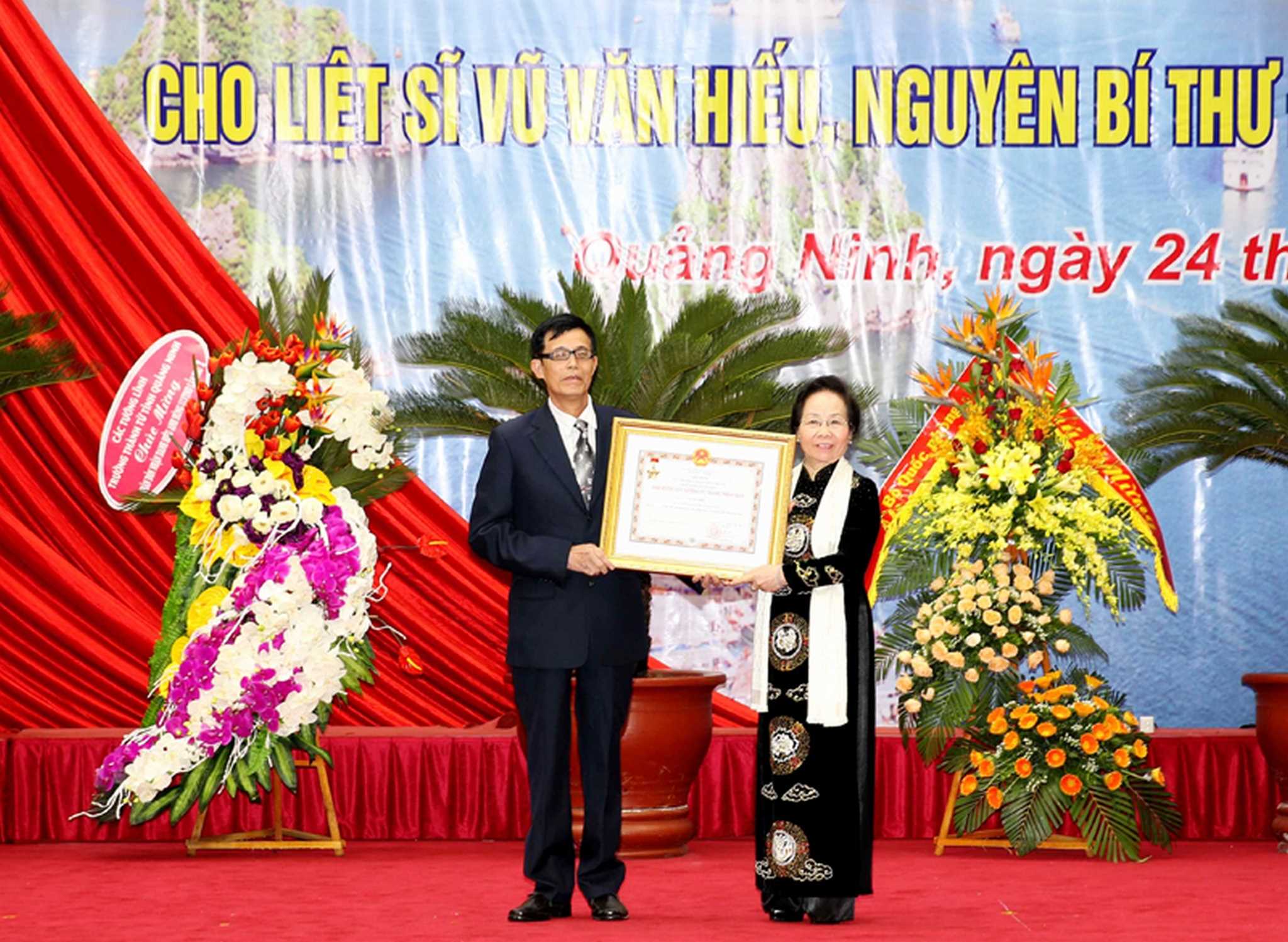 Thừa ủy quyền của Chủ tịch nước, Phó Chủ tịch nước Nguyễn Thị Doan trao danh hiệu Anh hùng Lực lượng vũ trang nhân dân cho liệt sĩ Vũ Văn Hiếu. Ông Vũ Hồng Hưng, cháu ruột của liệt sĩ Vũ Văn Hiếu đại diện gia đình đón nhận. Ảnh: Khánh Giang