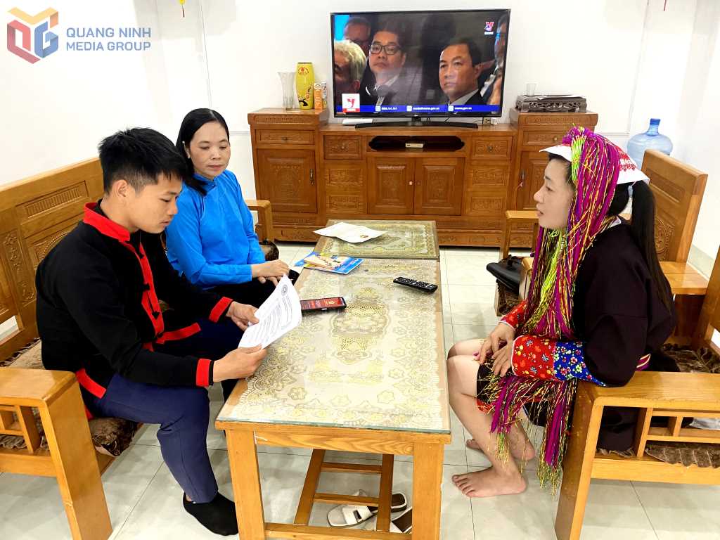 Thành viên Tổ công nghệ số thôn Tân Sơn, xã Quảng Tân đến tận nhà tuyên truyền cho người dân. Ảnh: Ngọc Trâm