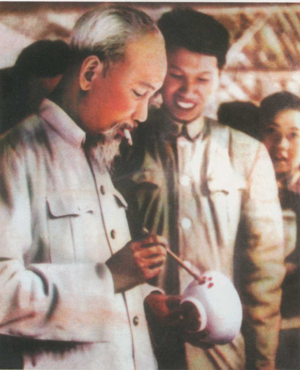 Bác Hồ thăm xưởng gốm sứ Dụ Phong. Người đã vẽ hoa văn lên sản phẩm bát sứ của xưởng gốm. Ảnh tư liệu.