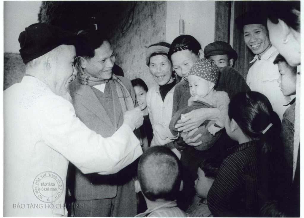 Bác Hồ chúc Tết gia đình ông bà Trần Mộc Sinh, dân tộc Hoa ở thôn Khe Cát, xã Minh Thành, huyện Yên Hưng (nay là phường Đông Mai), ngày 02/02/1965. Ảnh tư liệu.
