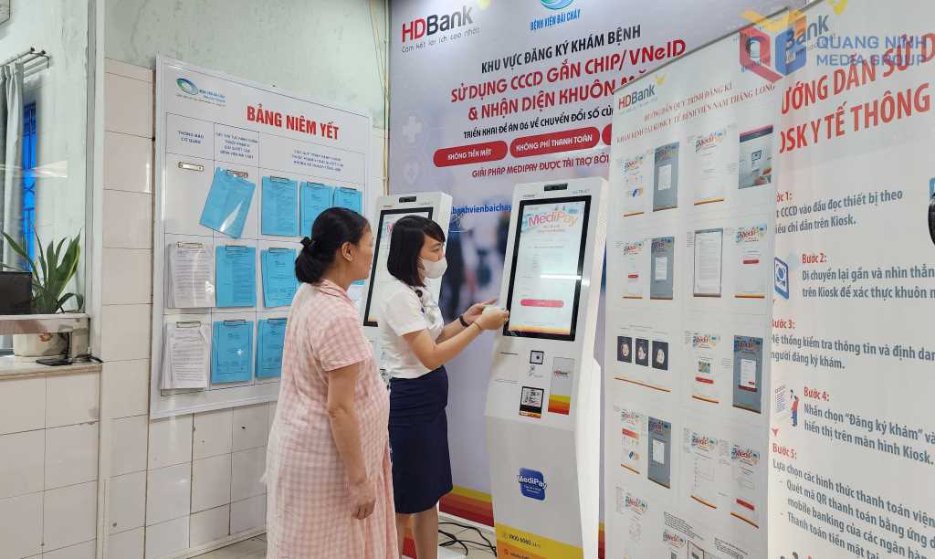 Người dân được hướng dẫn đăng ký khám bệnh tại Kiosk y tế thông minh của Bệnh viện Bãi Cháy.