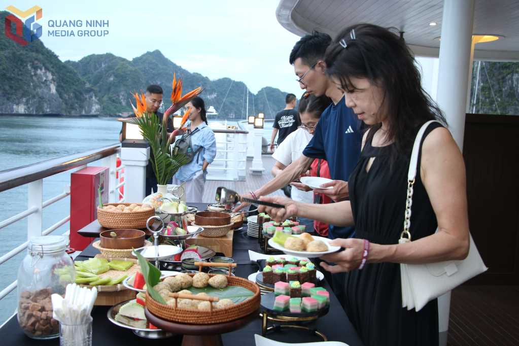 Du khách thưởng thức trà chiều trên du thuyền Paradise Legacy với các món bánh truyền thống Việt Nam.